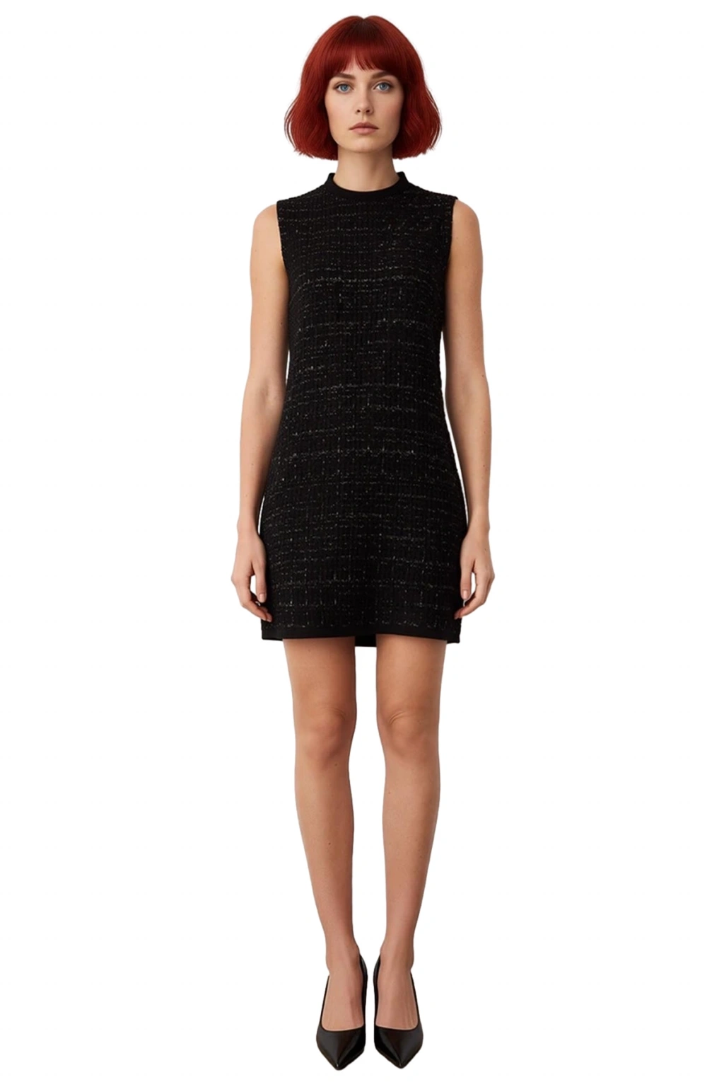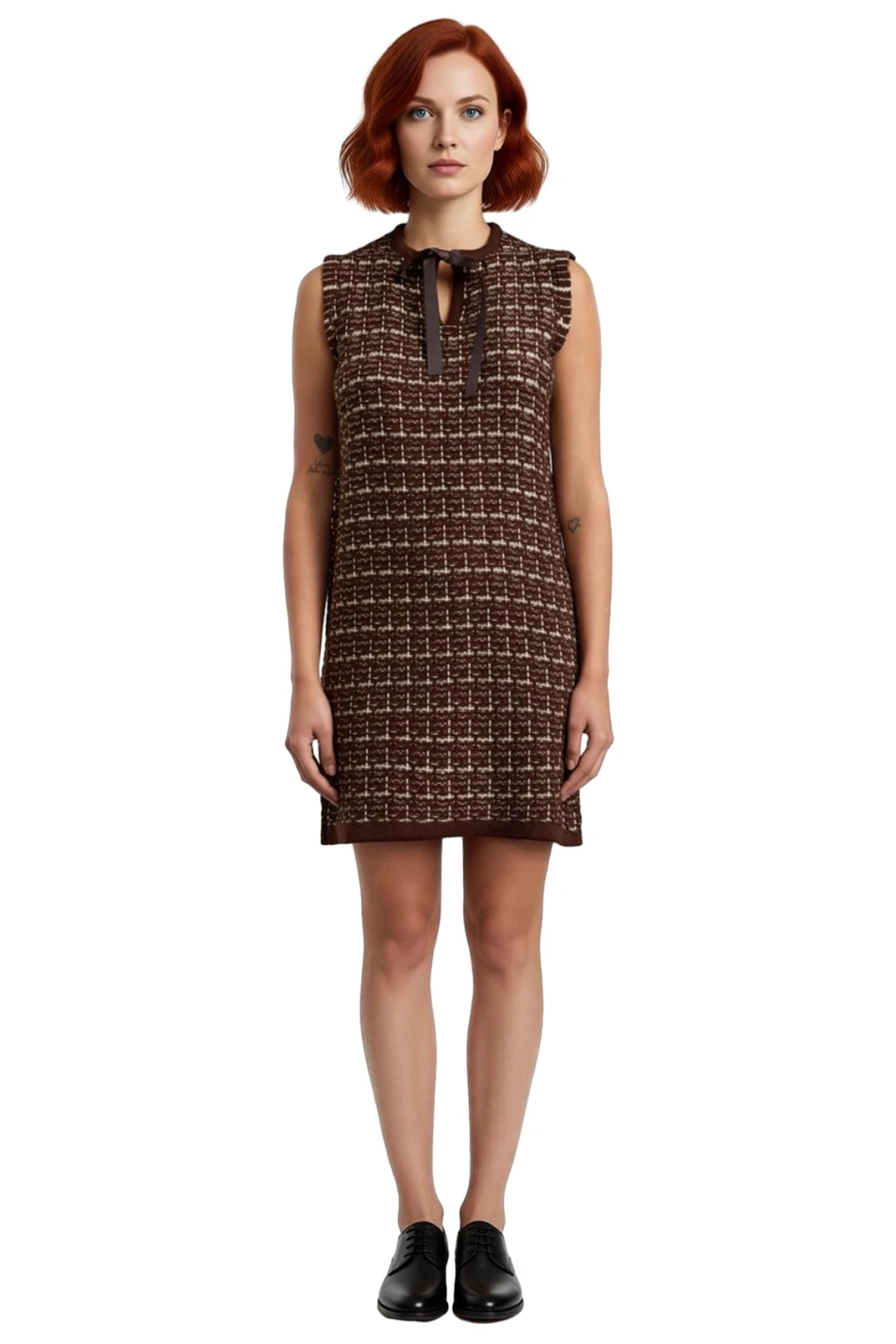 Bu kadın mini elbise, tüvit görünümlü dokulu deseni ve sıcak kahverengi tonuyla zamansız bir şıklık sunar. Shift kalıbı, bedene nazikçe oturarak gün boyu rahatlık ve zarif bir duruş sağlar. Özel olarak harmanlanmış akrilik, metalize iplik ve polyester materyali sayesinde yumuşak bir dokunuşa sahiptir ve hafif metalik parıltısıyla dikkat çeker. Triko kumaş yapısı, "Cool & Comfort" persona tanımına uygun olarak hem sıcak tutar hem de esneklik sunar.