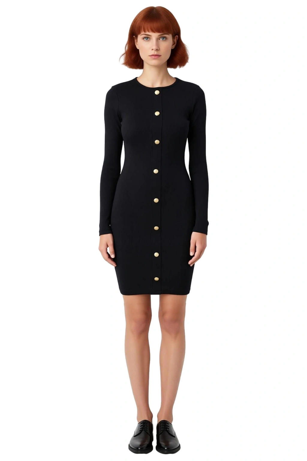 Bisiklet yaka tasarımı, zamansız ve klasik bir dokunuş katarken, uzun standart kolları soğuk havalarda sıcak tutar ve rahat bir kullanım sunar. Örme kumaş yapısı, hafif ve nefes alabilir özellikleriyle gün boyu ferahlık sağlarken, esnekliği sayesinde hareket özgürlüğünüzü destekler. Ön kısmında yer alan göz alıcı düğme detayları elbiseye dinamik bir karakter kazandırır ve kolayca giyilip çıkarılmasını sağlar. Astarsız tasarımıyla hafiflik sunan bu elbise, makinede yıkanabilir özelliği sayesinde pratik bir bakım imkanı sunar.