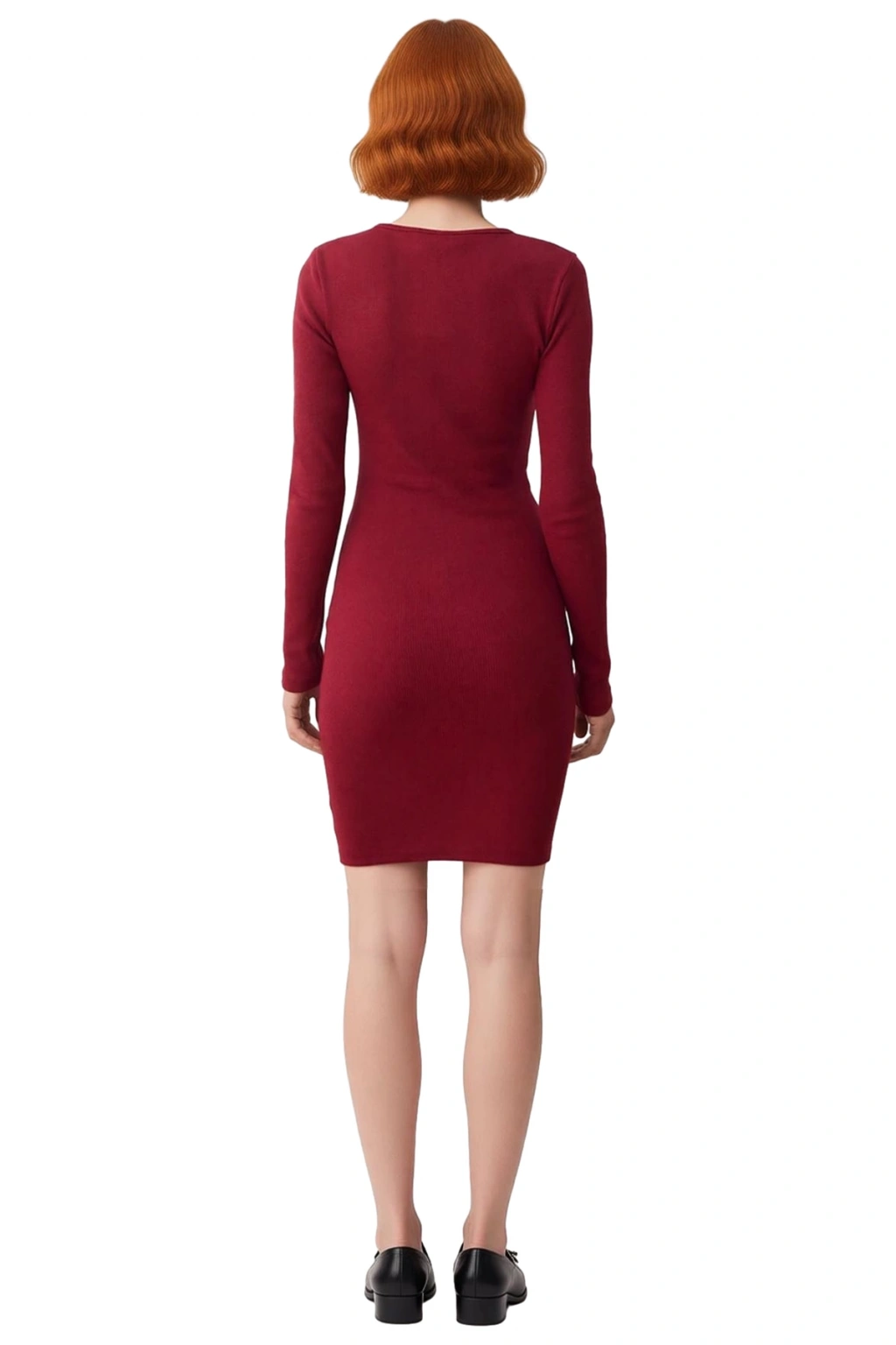 Ürün Özellikleri: Bodycon kalıp, polyester materyal, düz desen, bisiklet yaka, standart kol, örme kumaş, bordo renk, düğmeli tasarım.