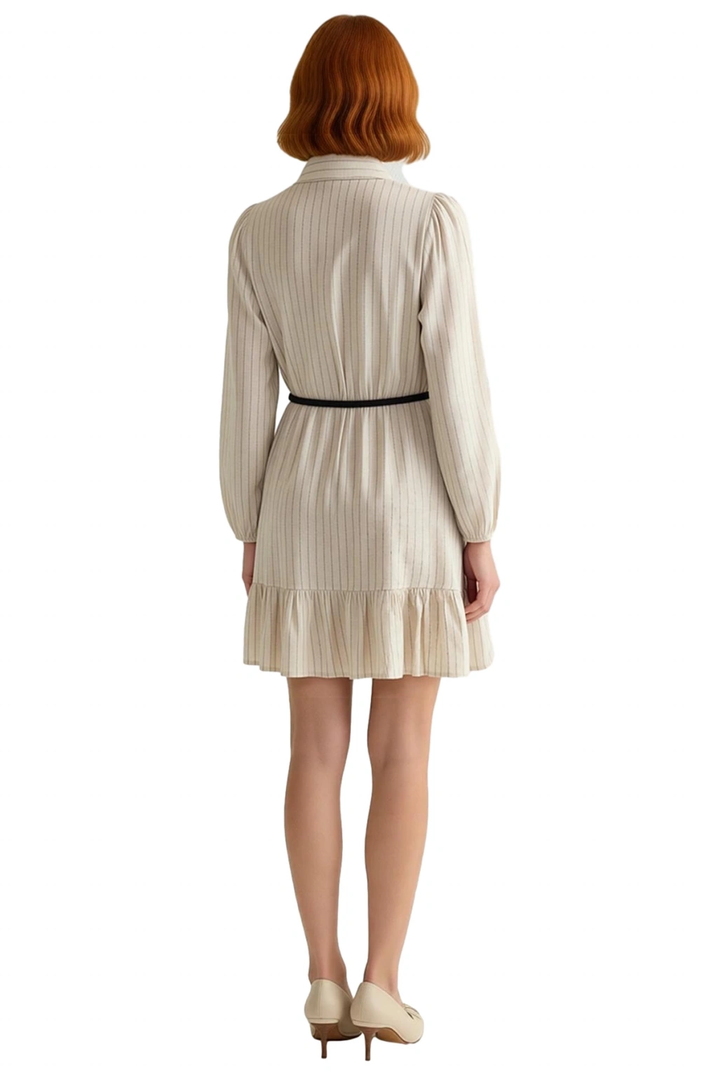 Ürün Özellikleri: Skater kalıp, polyester materyal, çizgili desen, gömlek yaka, standart kol, dokuma kumaş, bej renk, düğmeli tasarım.