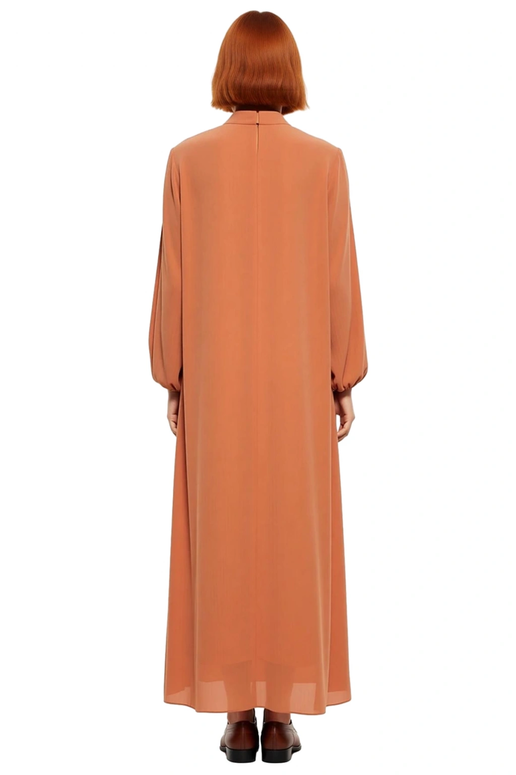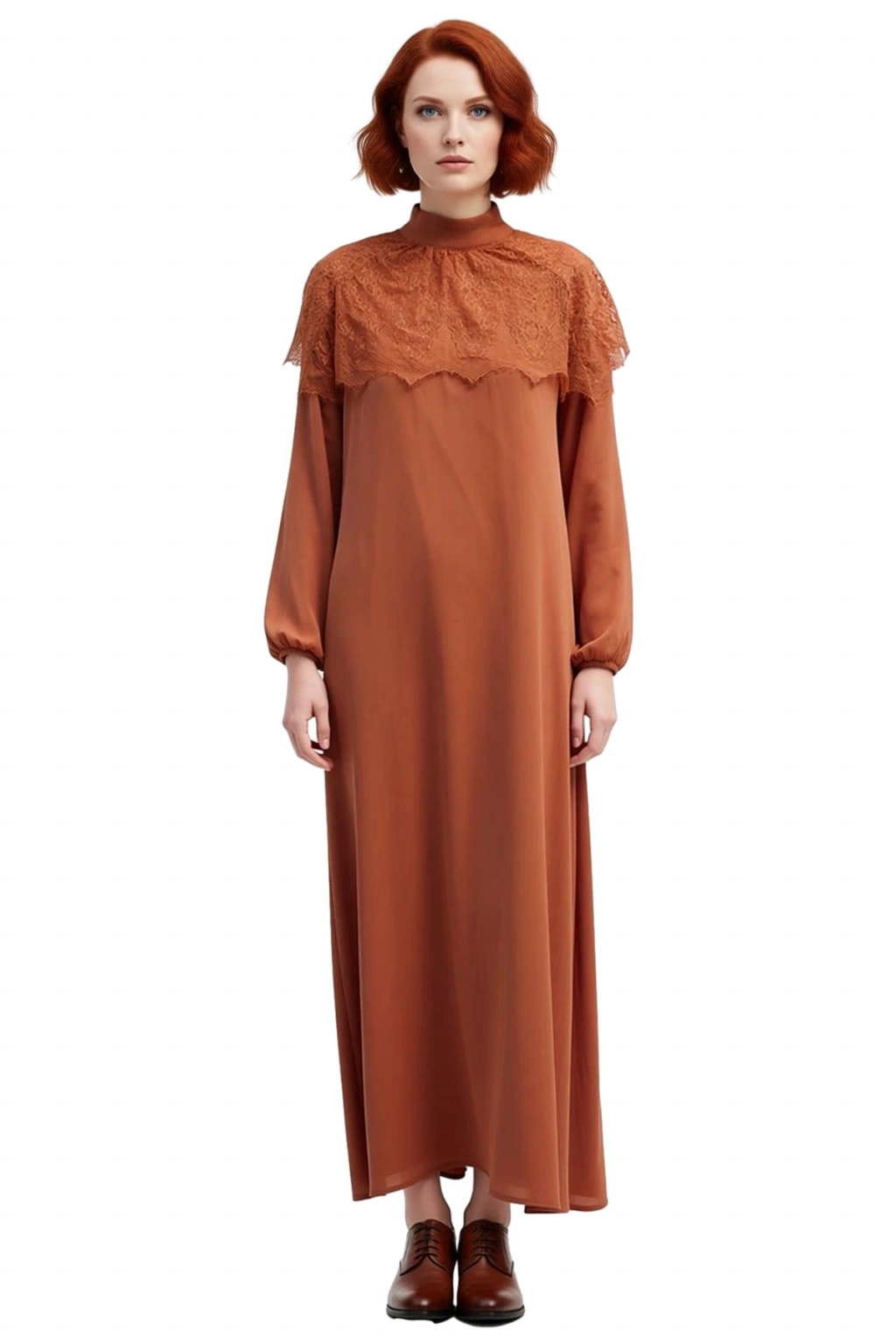 Ürün Özellikleri: Skater kalıp, %100 polyester materyal, düz desen (dantel pelerin detaylı), dik yaka, standart kol, dokuma yoryo şifon kumaş, tarçın renk.
