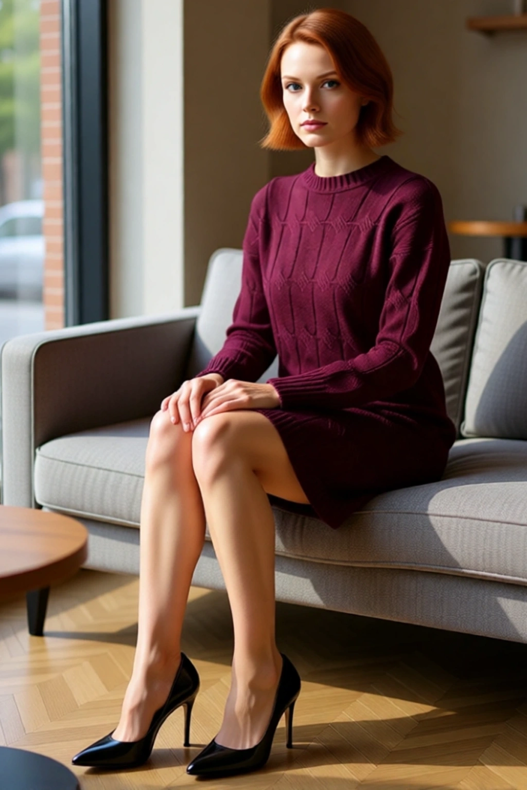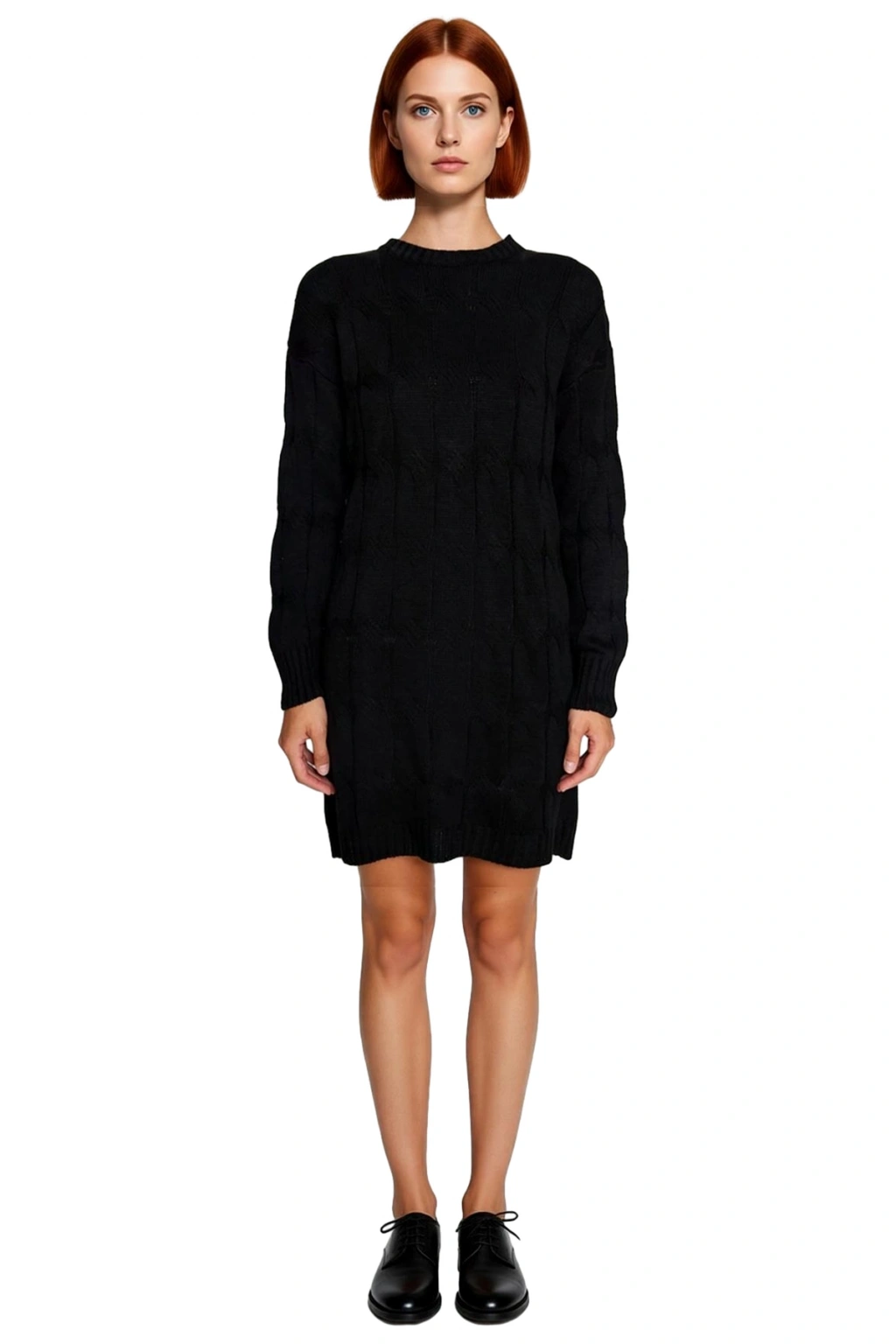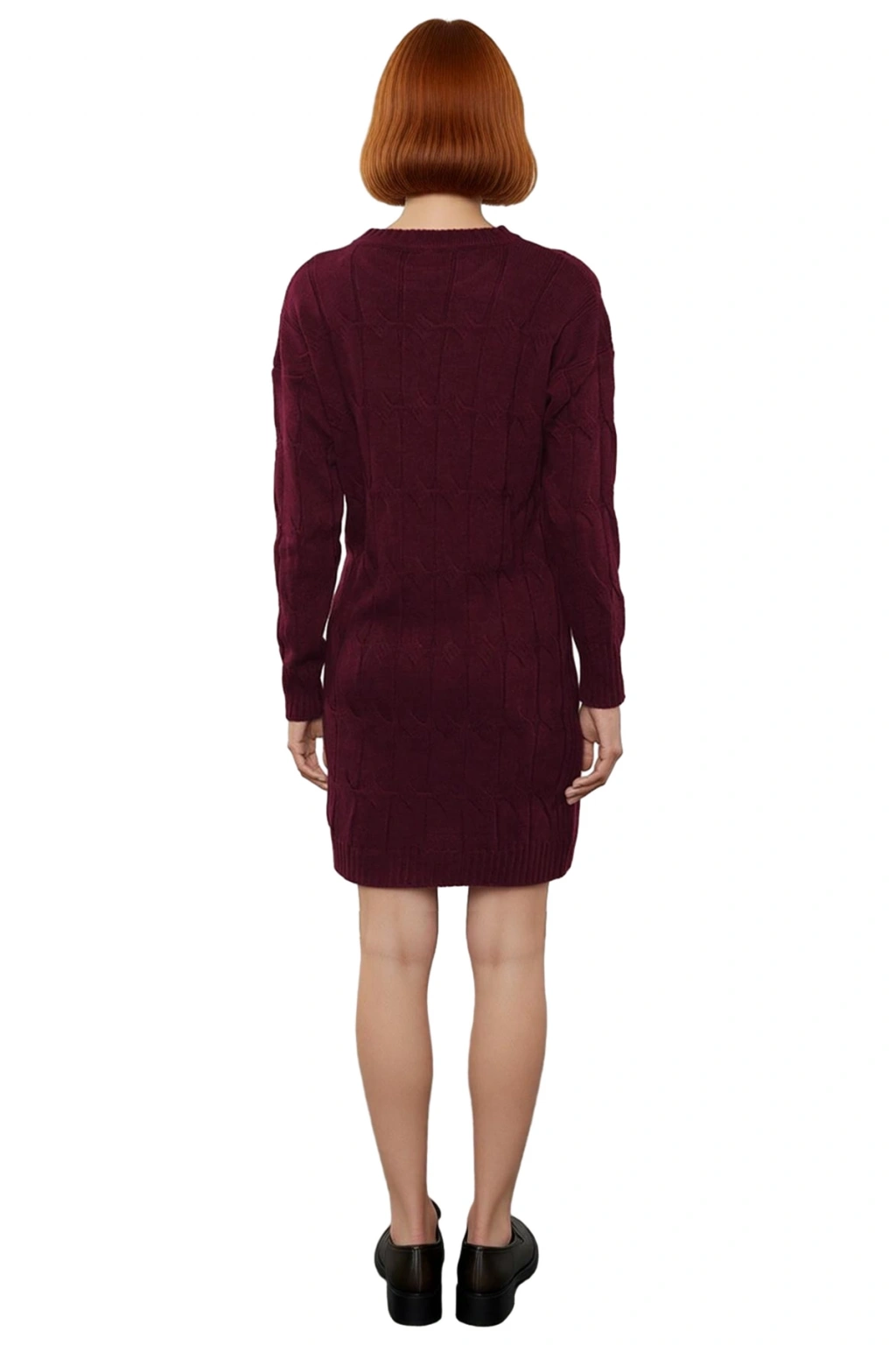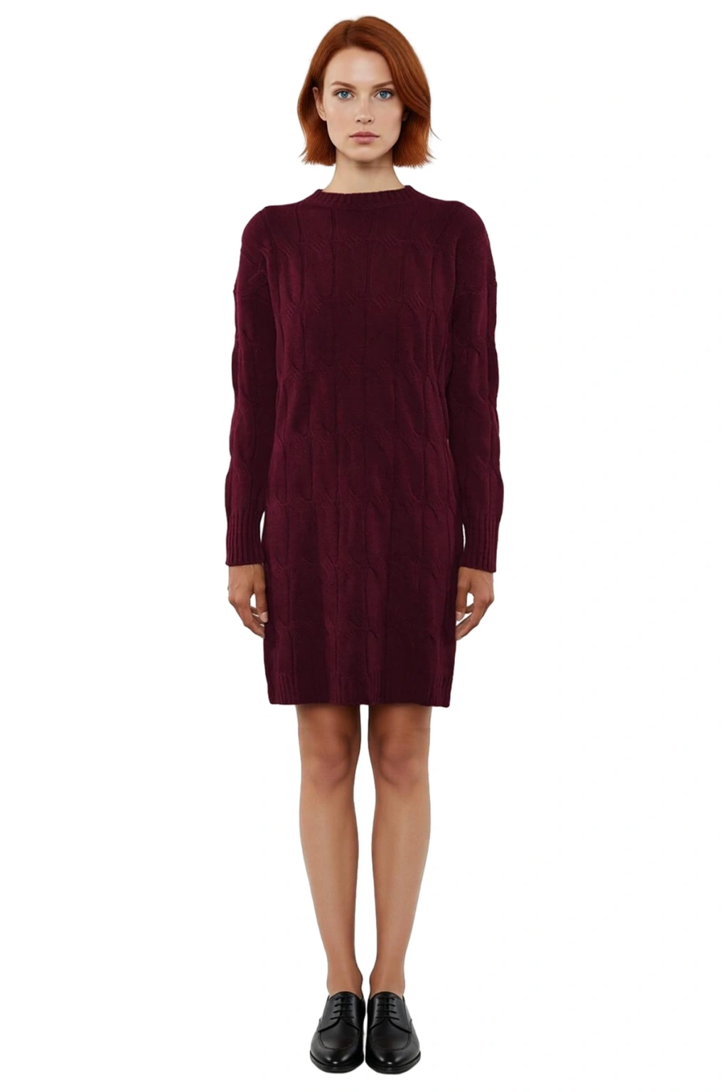 Ürün Özellikleri: Shift kalıp, akrilik materyal, saç örgü desen, bisiklet yaka, düşük kol, triko kumaş, bordo renk.