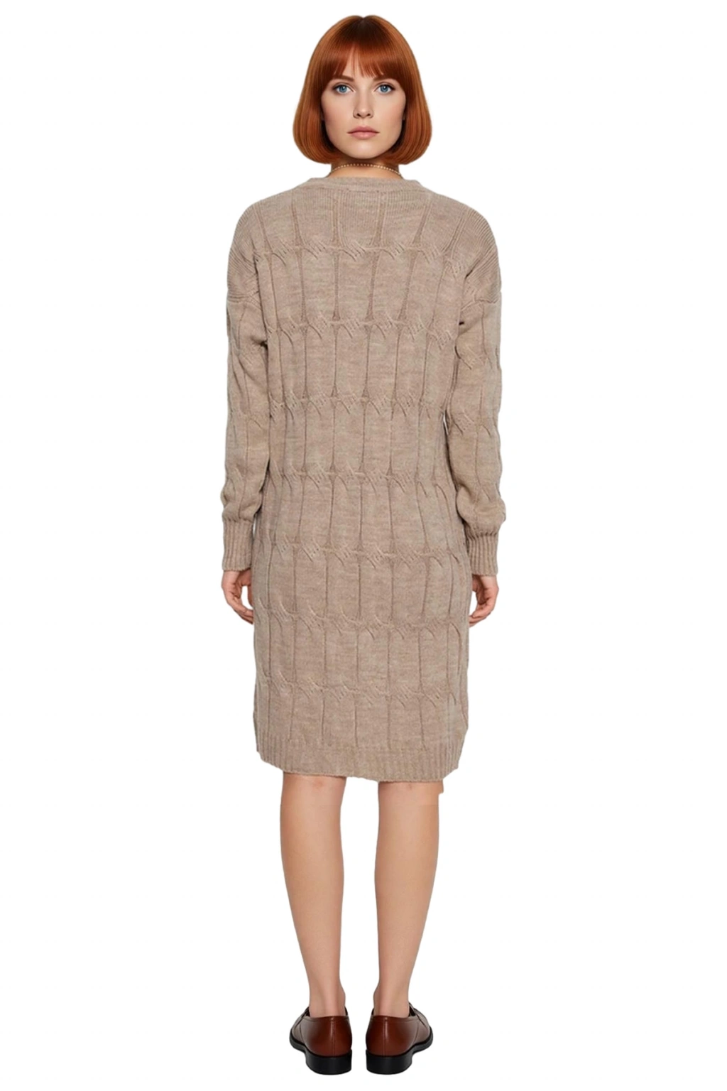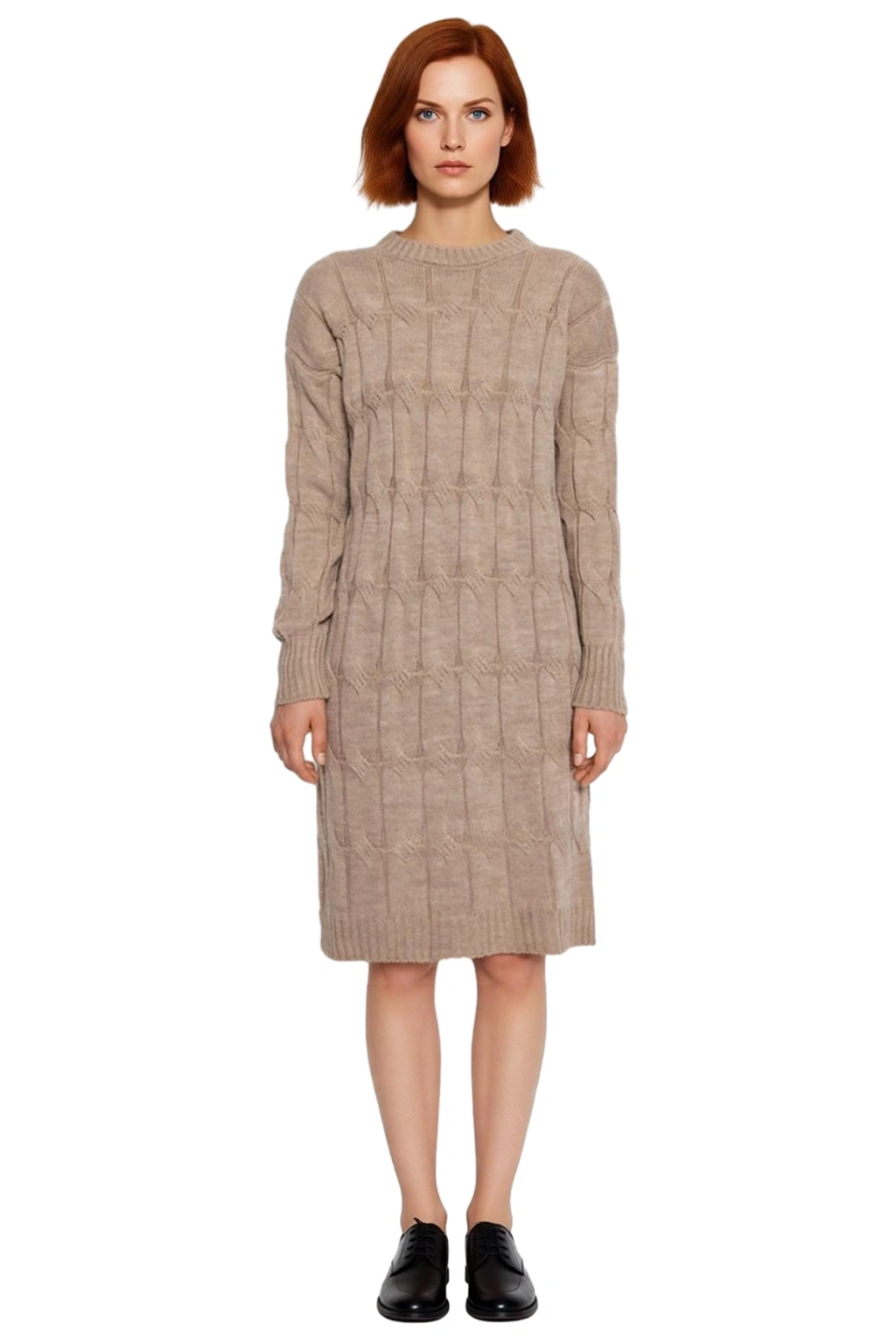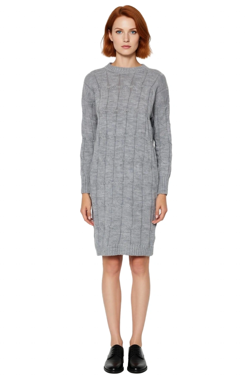 Kadınlara özel bu uzun kol düşük omuz triko elbise, shift kalıbı ile modern ve rahat bir duruş sergiler. %100 akrilik materyalden üretilen bu parça, orta kalınlığı sayesinde serin havalarda ideal bir sıcaklık sunarken, cilde yumuşak bir dokunuş hissi verir. Bordo rengi ile sonbahar ve ilkbahar gardırobunuzun yıldız parçası olmaya adaydır. Saç örgü deseni elbiseye zengin bir doku katarken, cool & comfort persona anlayışıyla gün boyu konfor ve şıklığı bir arada sunar.