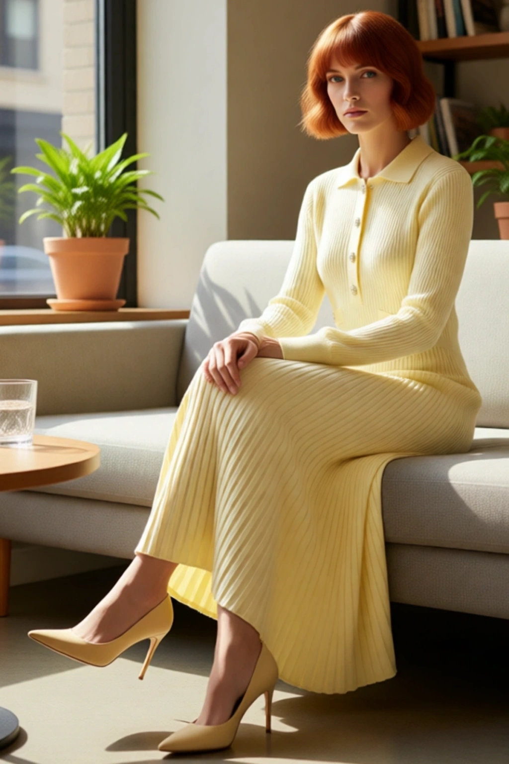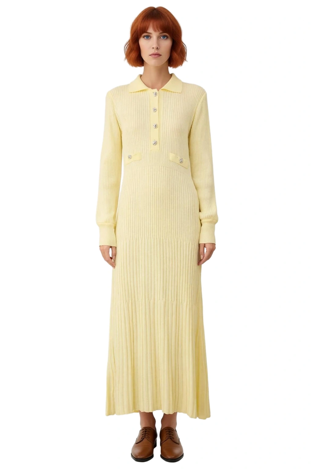 Ürün Özellikleri: A-line kalıp, 100% akrilik materyal, düz desen, polo yaka, standart uzun kol, triko ribana kumaş, sarı renk, astarsız tasarım.