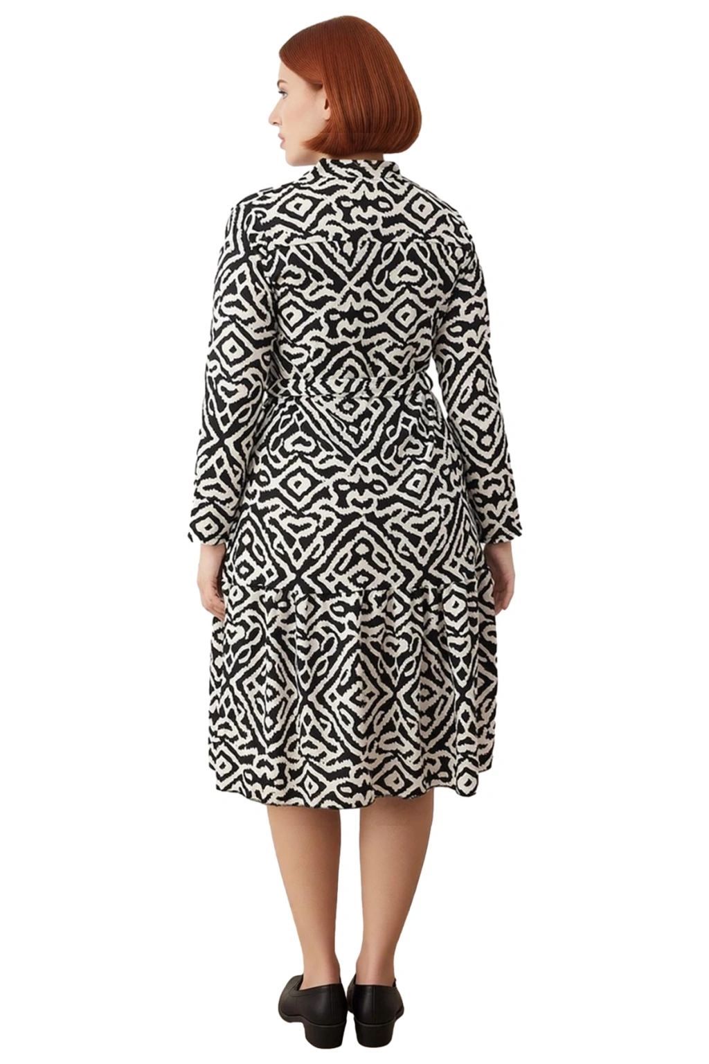 Ürün Özellikleri: A-line kalıp, 100% polyester materyal, etnik desen, polo yaka, standart kol, örme kumaş, siyah renk.