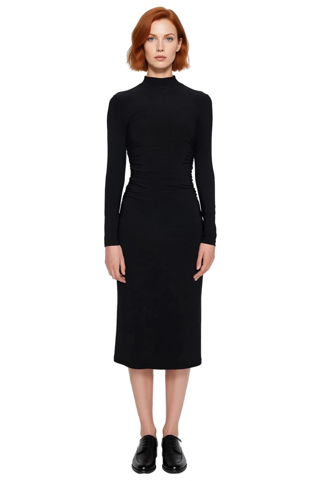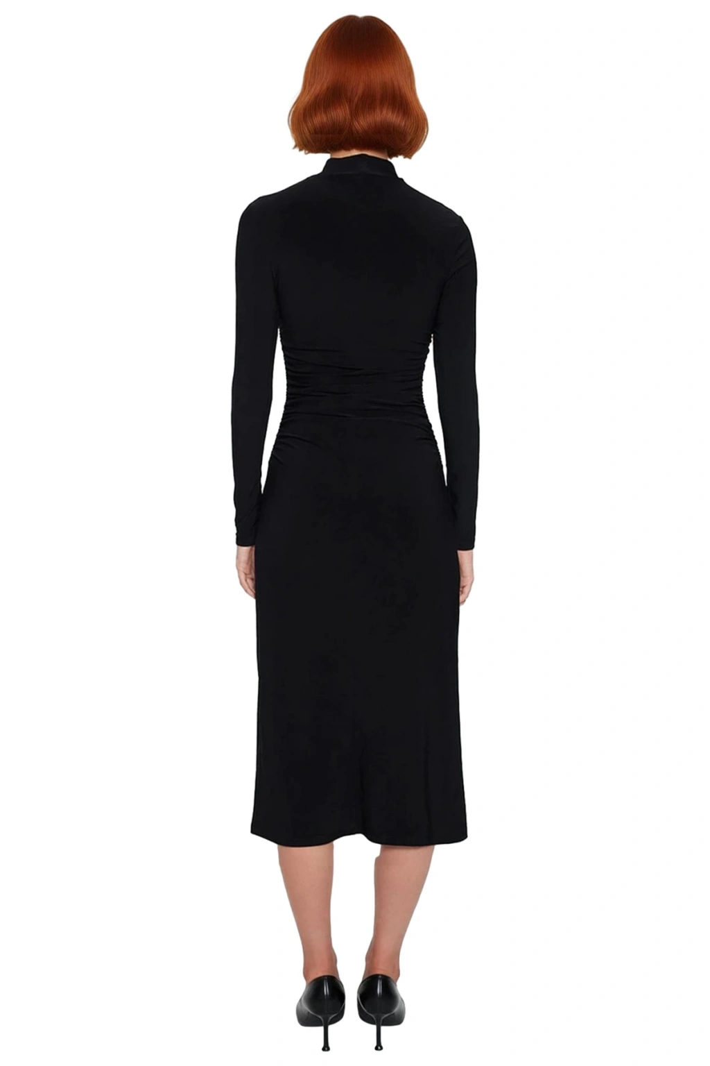 Ürün Özellikleri: Bodycon kalıp, polyester karışımlı materyal, düz desen, dik yaka, standart kol, örme kumaş, siyah renk.