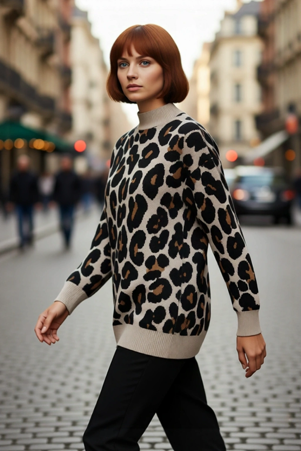 Bu göz alıcı kadın kazak, relaxed kalıbıyla rahatlığı ve modern çizgileri bir araya getirerek günlük stilinize sofistike bir hava katar. %100 akrilik materyalden üretilen bu üstün kaliteli triko, kış soğuklarına karşı mükemmel bir koruma sağlarken, teninize narin ve yumuşak bir dokunuş sunar. Canlı animal deseni ile dikkatleri üzerinize çekerken, bej rengin sakin tonları sayesinde her gardıropla uyum içinde bir görünüm sergiler. Jakar dokuma tekniği, desenin zenginliğini ve kumaşın dokusal kalitesini vurgular ve Cool & Comfort personasını başarıyla yansıtır.