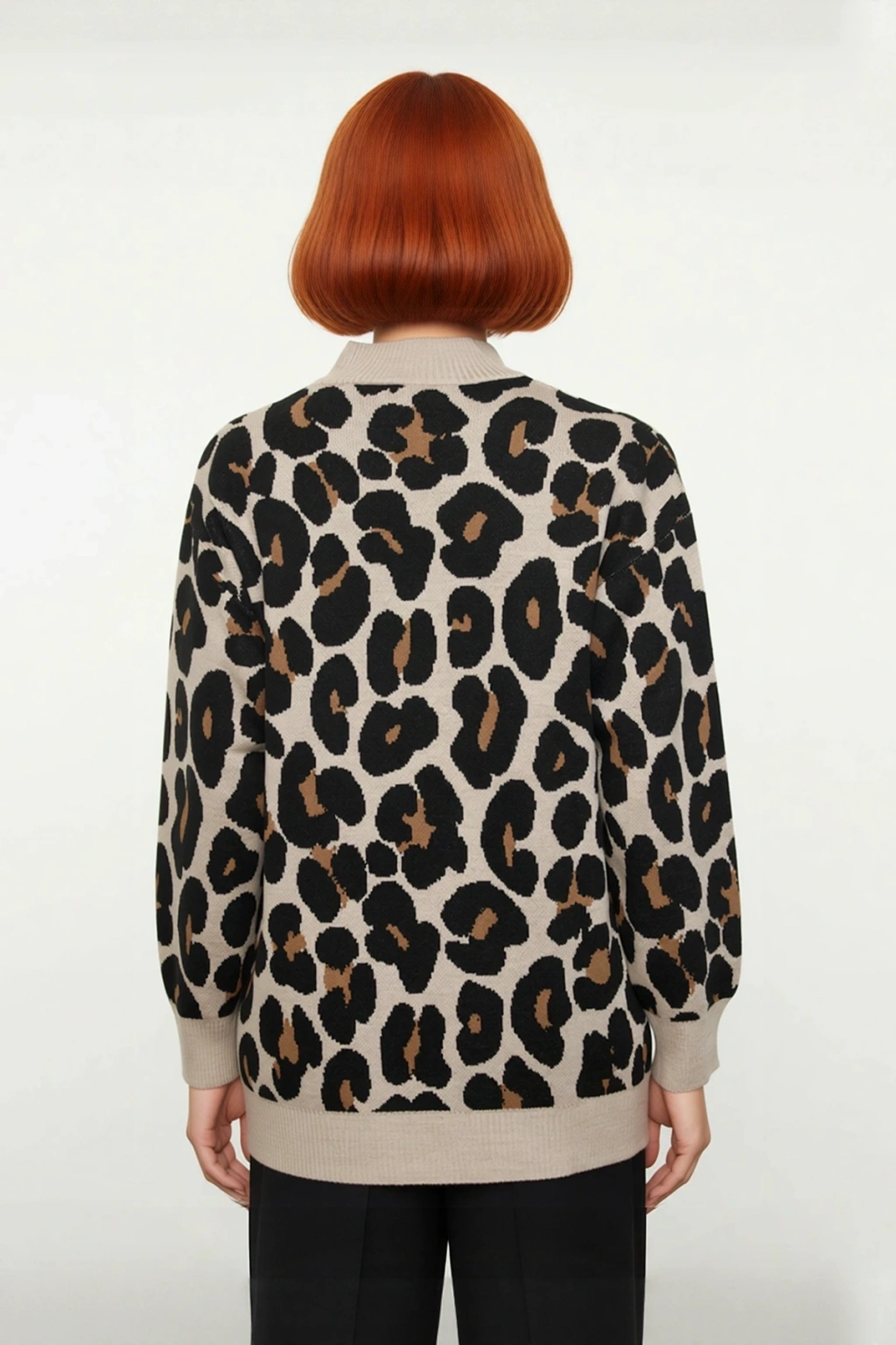 Ürün Özellikleri: Relaxed kalıp, 100% akrilik materyal, animal desen, dik yaka, standart kol, triko kumaş, bej renk, jakar dokuma.