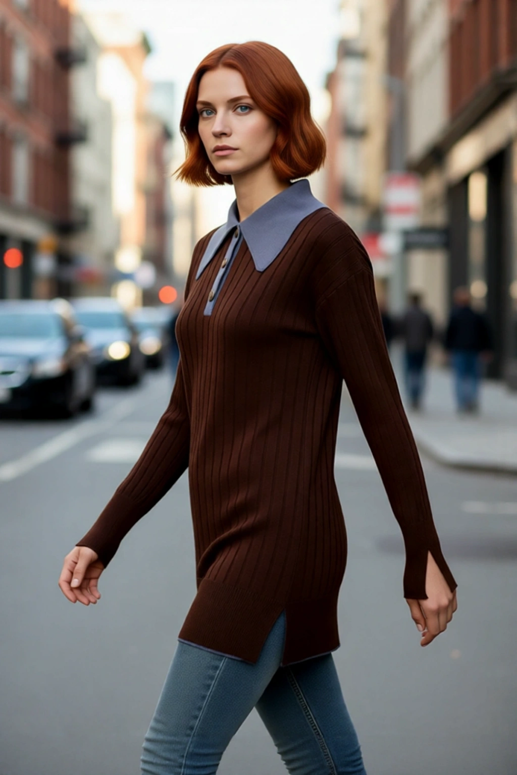 Modern Kadınların günlük şıklığını tamamlayacak bu fitted triko kazak, konfor ve zarafeti bir araya getiriyor. Vücuda tam oturan fitted kalıbı, stilinize sofistike bir dokunuş katarken, %100 akrilik materyali sayesinde gün boyu yumuşacık bir his ve sıcaklık sunar. Dokulu örme deseniyle öne çıkan bu parça, kahverengi ana rengi ve mavi polo yaka kontrastıyla dikkat çekici bir estetik sunar. Yarım patlı ve düğmeli tasarımı, kazaklara özgü rahatlığı şık bir detayla harmanlar, böylece hem rahat hem de göz alıcı bir görünüm sağlar.
