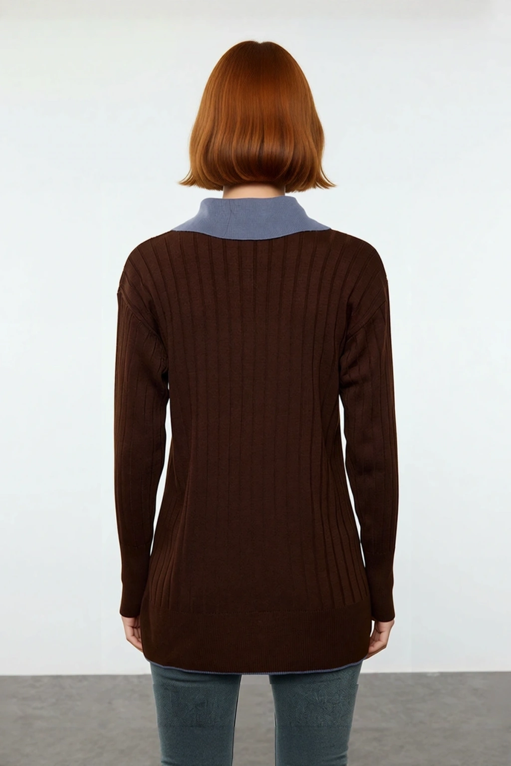 Ürün Özellikleri: Fitted kalıp, %100 akrilik materyal, dokulu desen, polo yaka, düşük kol, triko kumaş, kahverengi/mavi renk, yarım patlı tasarım.