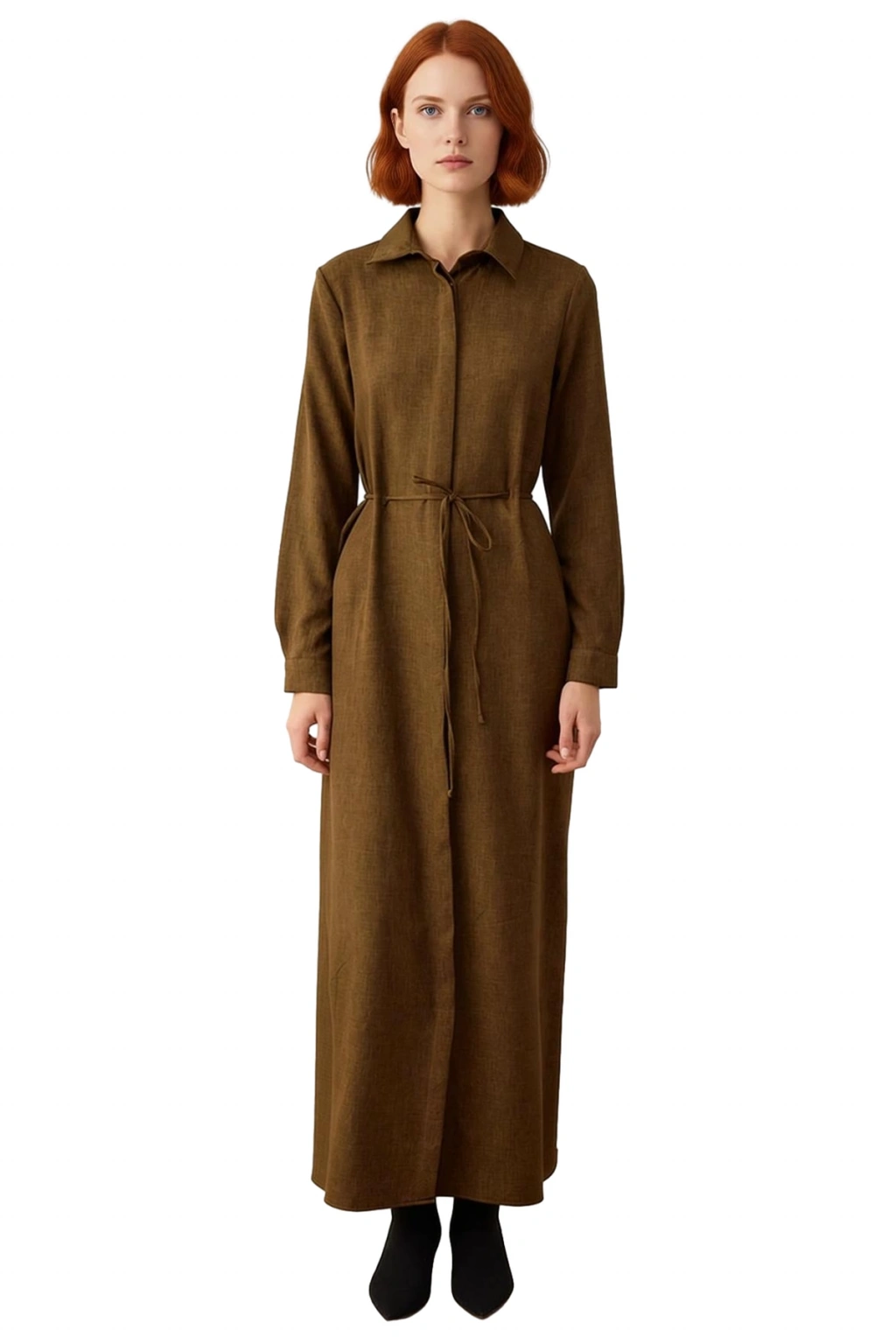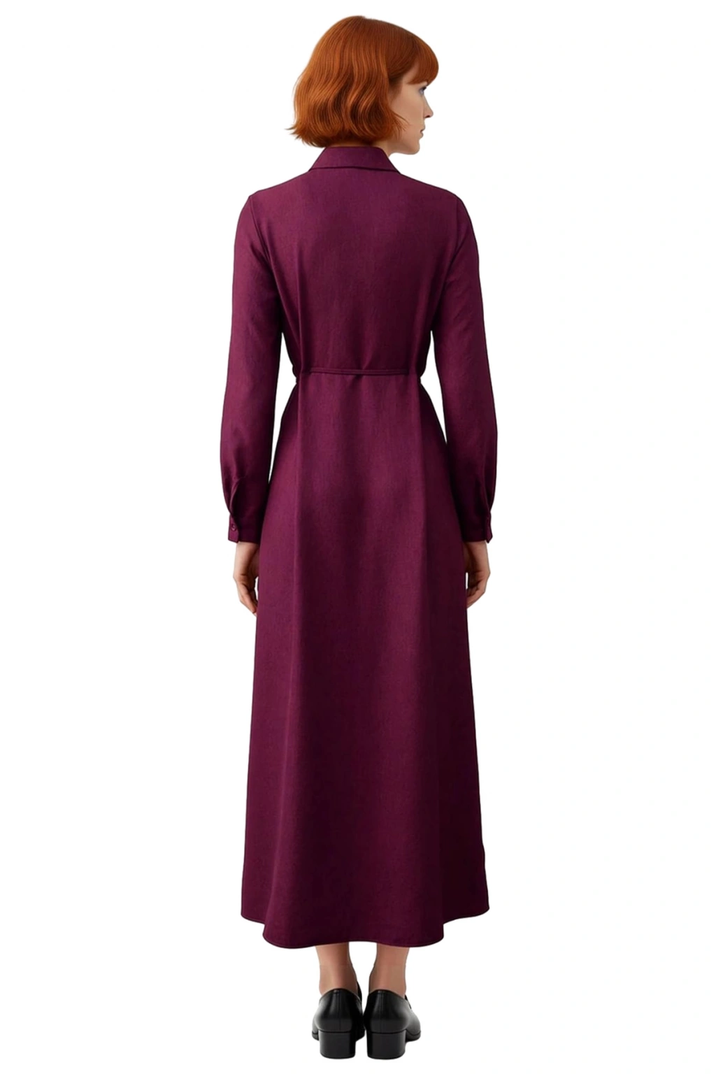 Ürün Özellikleri: A-line kalıp, %100 polyester materyal, düz desen, gömlek yaka, standart kol, dokuma kumaş, bordo renk, astarsız tasarım, maxi boy.