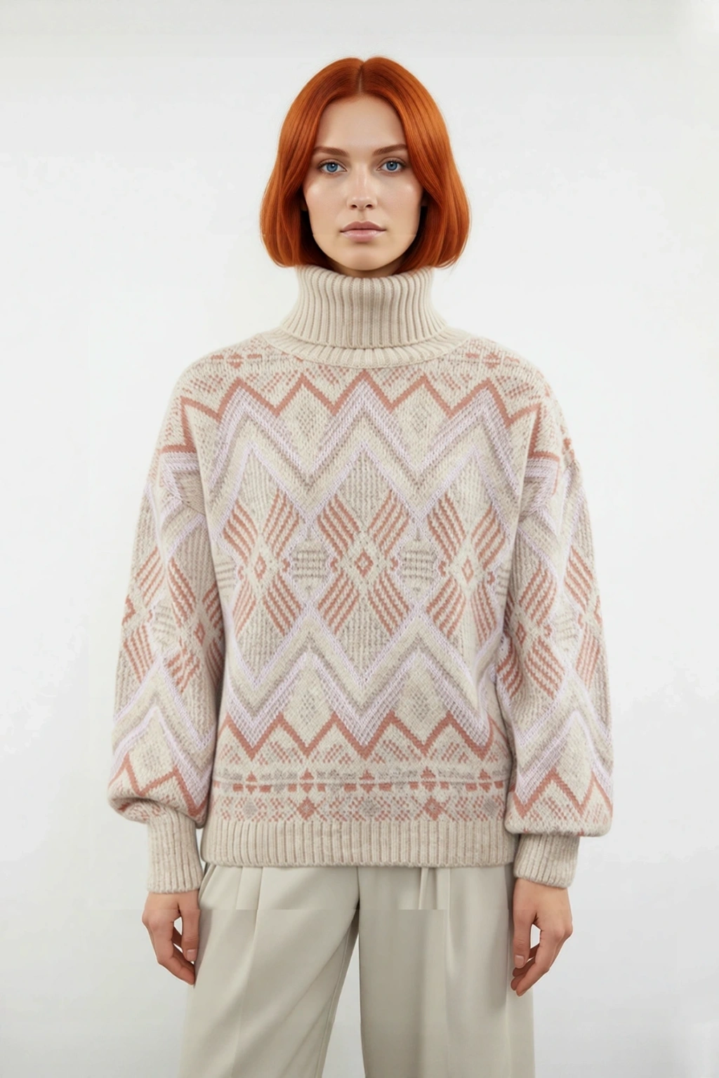 Günlük şıklığınızı tamamlayacak bu Kadın Uzun Kollu Oversize Kesim Etnik Desenli Balıkçı Yaka Akrilik Triko Kazak, kış gardırobunuzun temel parçalarından biri olacak. Yumuşak dokulu akrilik materyali sayesinde cildinize narin bir dokunuş sunarken, soğuktan korunmanızı sağlar. Modern oversize kalıbı, rahat ve şık bir görünüm sunarak gün boyu hareket özgürlüğü verir. Kazak üzerindeki dikkat çekici etnik desen, gri, bej ve pembe tonlarıyla kombinlenerek stilinize sofistike bir dokunuş ekler. Cepsiz tasarımı, kazağın akıcı hatlarını vurgularken, uzun boyu hem sıcaklık hem de modern bir estetik sunar. "Cool & Comfort" personasına sahip kadınlar için ideal bir seçimdir.