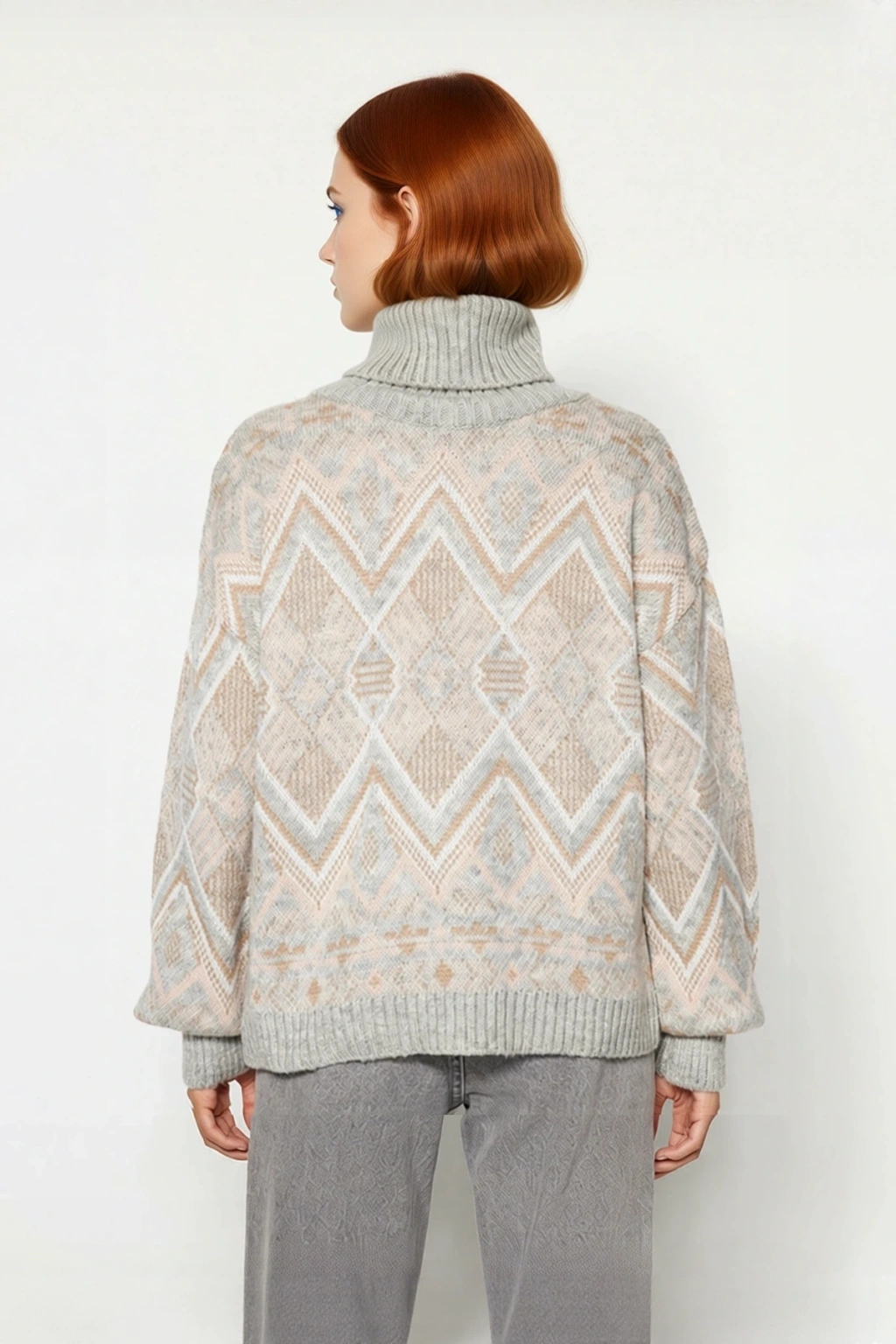 Ürün Özellikleri: Oversize kalıp, akrilik materyal, etnik desen, balıkçı yaka, düşük kol, triko kumaş, gri renk, cepsiz tasarım.