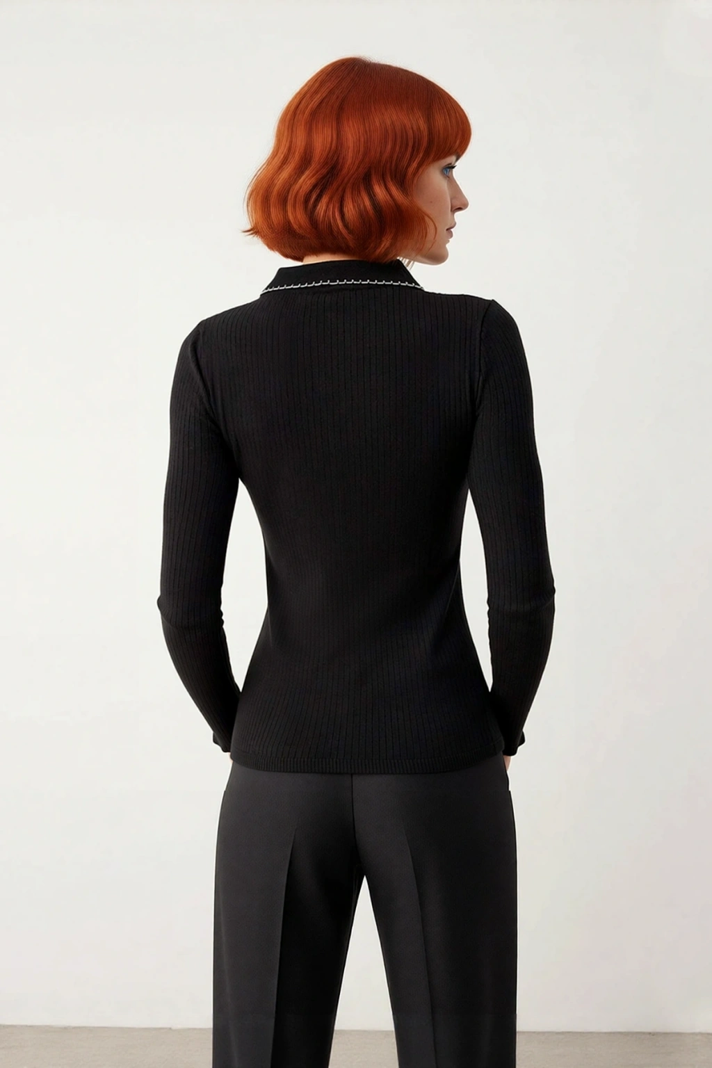 Ürün Özellikleri: Fitted kalıp, viskoz materyal, kontrast dikiş detaylı desen, polo yaka, standart kol, triko kumaş, siyah renk.