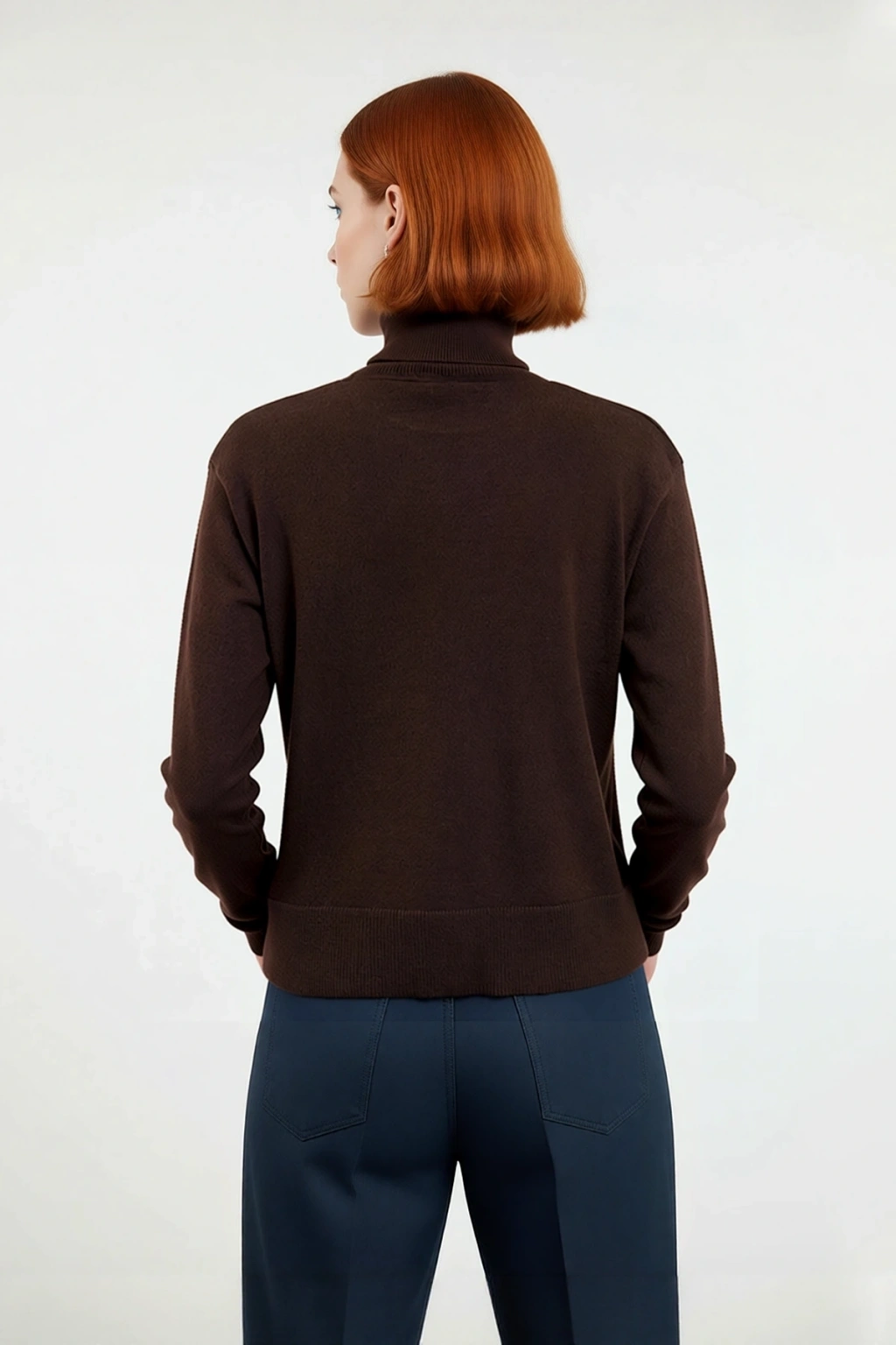 Ürün Özellikleri: Regular kalıp, yünlü materyal, düz desen, balıkçı yaka, standart kol, triko kumaş, kahverengi renk, baskısız tasarım, cepsiz.
