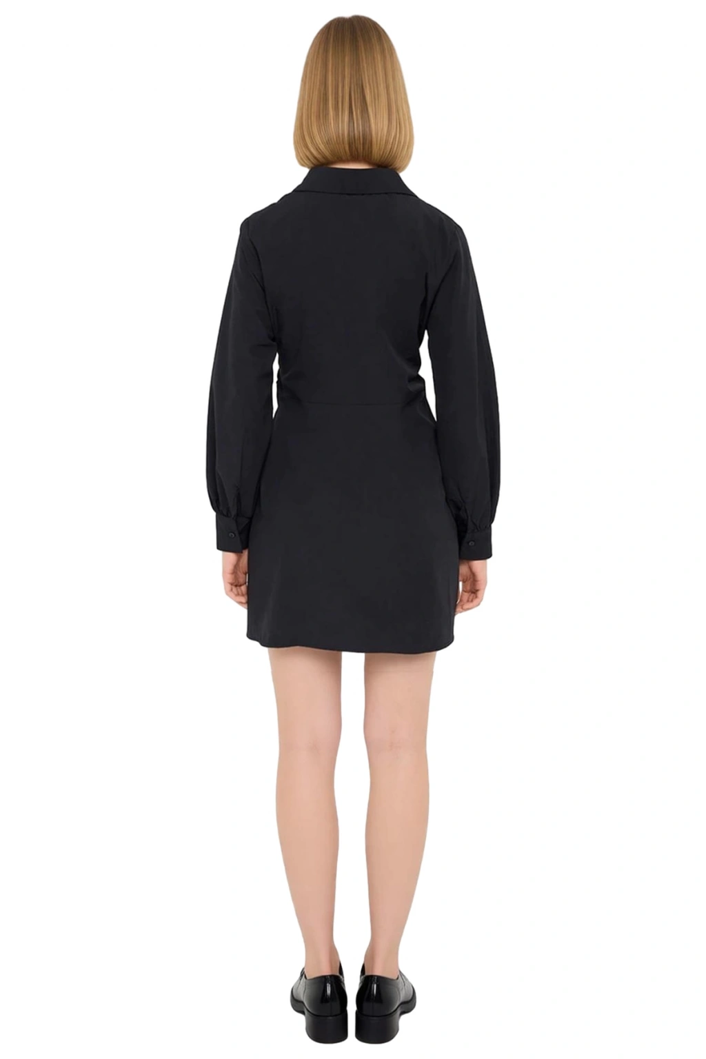 Ürün Özellikleri: A-line kalıp, pamuk polyester materyal, düz desen, kaçık yaka, düşük uzun kol, dokuma kumaş, siyah renk.