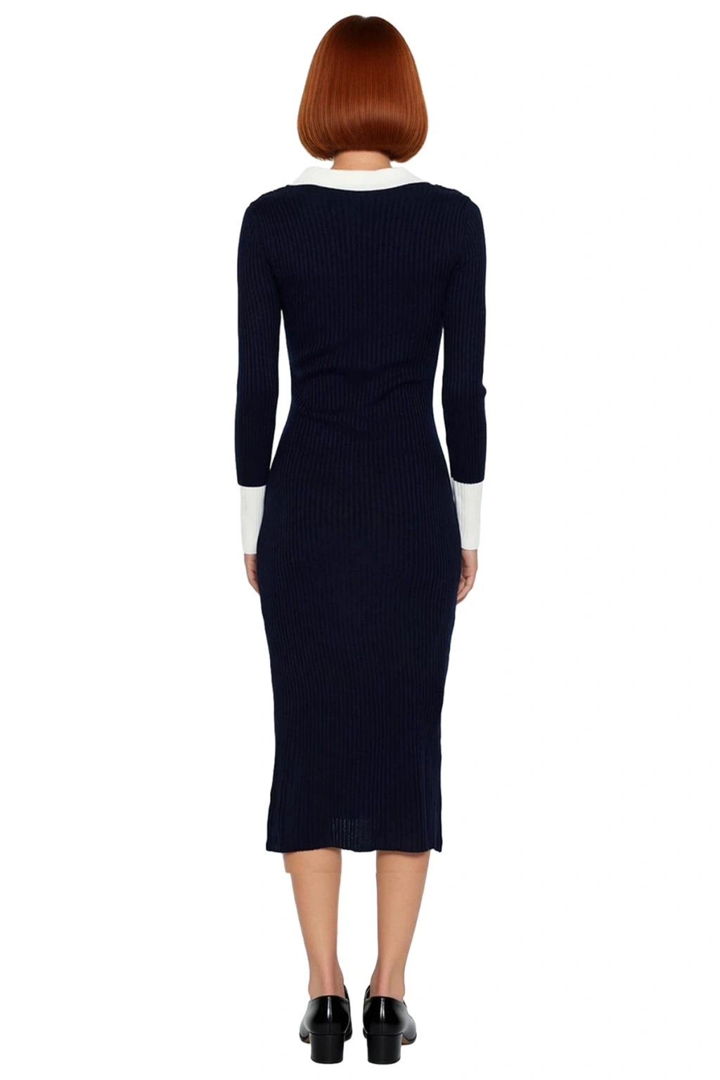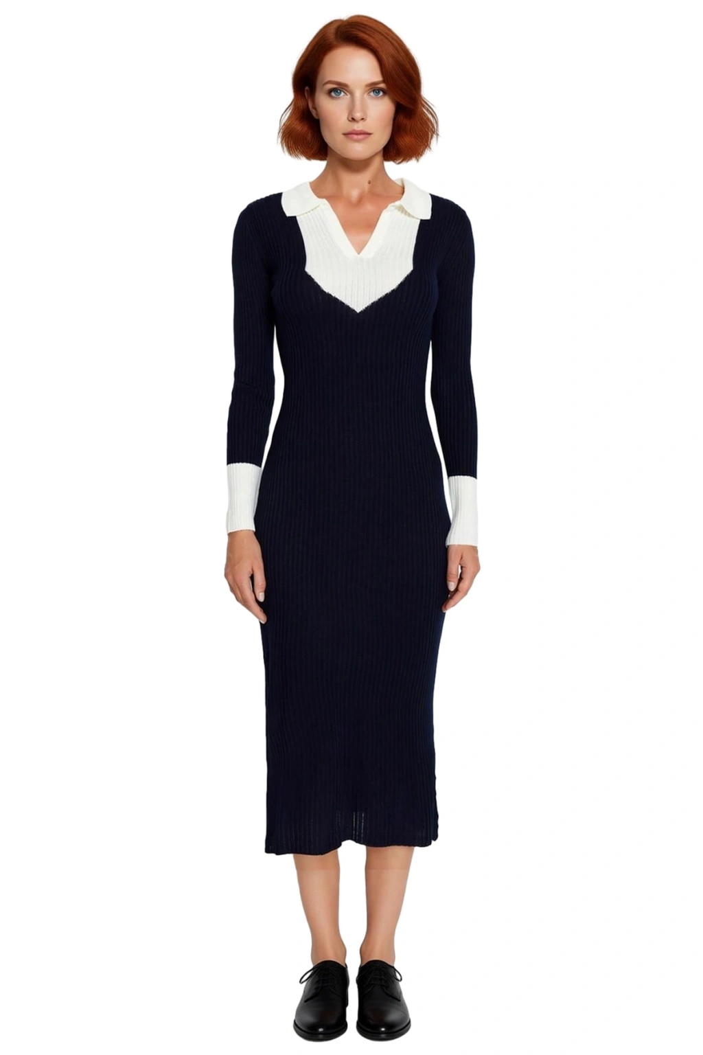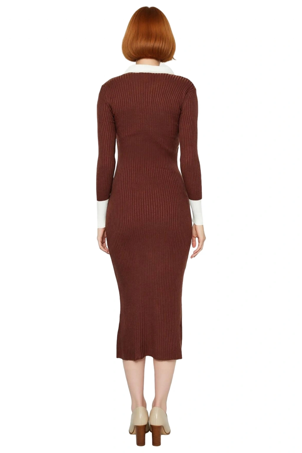 Ürün Özellikleri: Bodycon kalıp, triko materyal, renk bloklu desen, polo yaka, uzun standart kol, triko kumaş, kahverengi ve beyaz renk, baskısız tasarım.