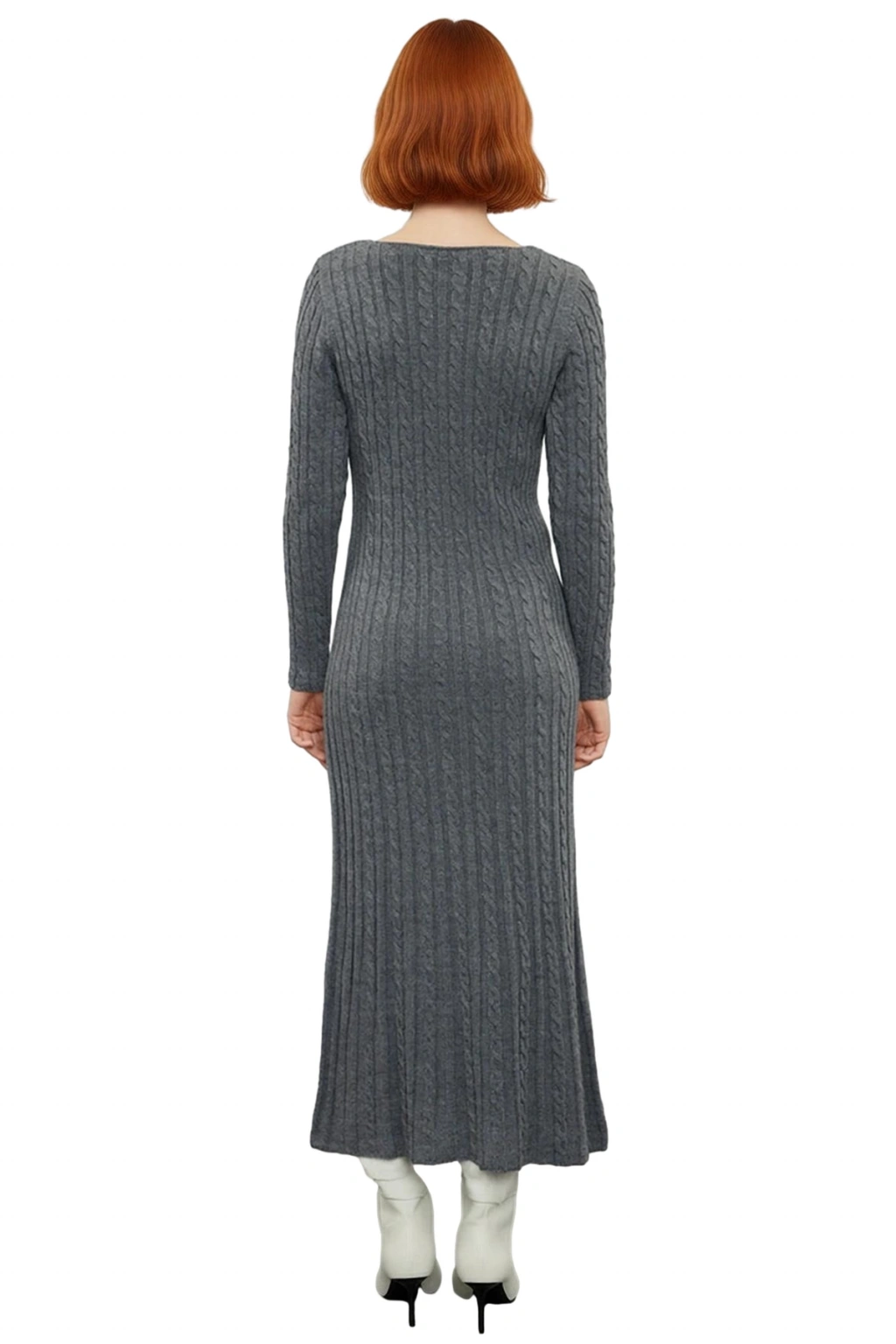 Ürün Özellikleri: A-line kalıp, %100 akrilik materyal, saç örgü desen, V yaka, standart uzun kol, triko kumaş, gri renk, baskısız tasarım.