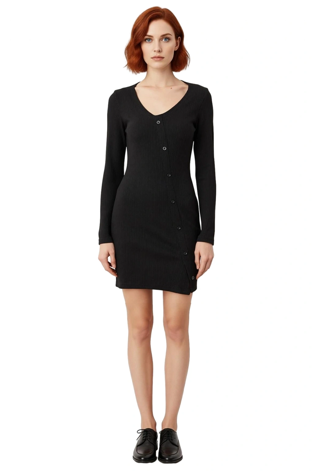 Zarif V yaka tasarımı dekolteye şık bir dokunuş katarken, uzun standart kol yapısı soğuk havalarda sıcaklık ve rahatlık sağlar. Fitilli örme kumaşı, esnek yapısıyla hareket özgürlüğünü destekler ve astarsız olmasına rağmen toparlayıcı bir etki sunar. Elbisenin önündeki estetik düğmeler, asimetrik silueti tamamlayarak görsel bir çekicilik yaratır ve giyimi kolaylaştırır. Kaliteli materyal içeriği sayesinde dayanıklılığıyla öne çıkan bu elbise, uzun süreli kullanıma uygun olup, makinede yıkanabilir özelliğiyle pratik bir bakım sunar. Günlük şıklığınızı tamamlamak için idealdir.