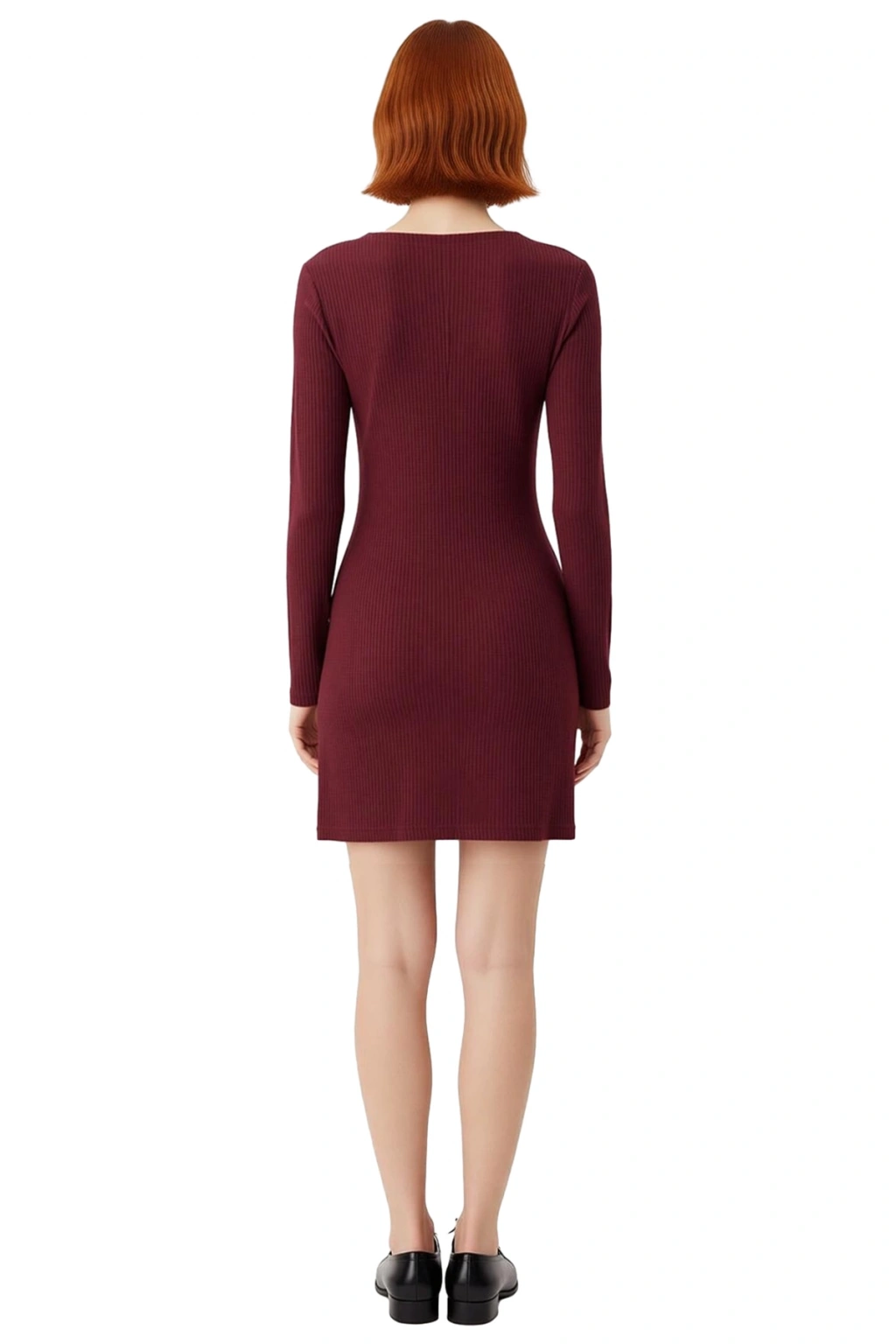 Ürün Özellikleri: Bodycon kalıp, polyester viskoz elastan materyal, düz desen, V yaka, standart kol, örme kumaş, bordo renk, düğmeli tasarım.
