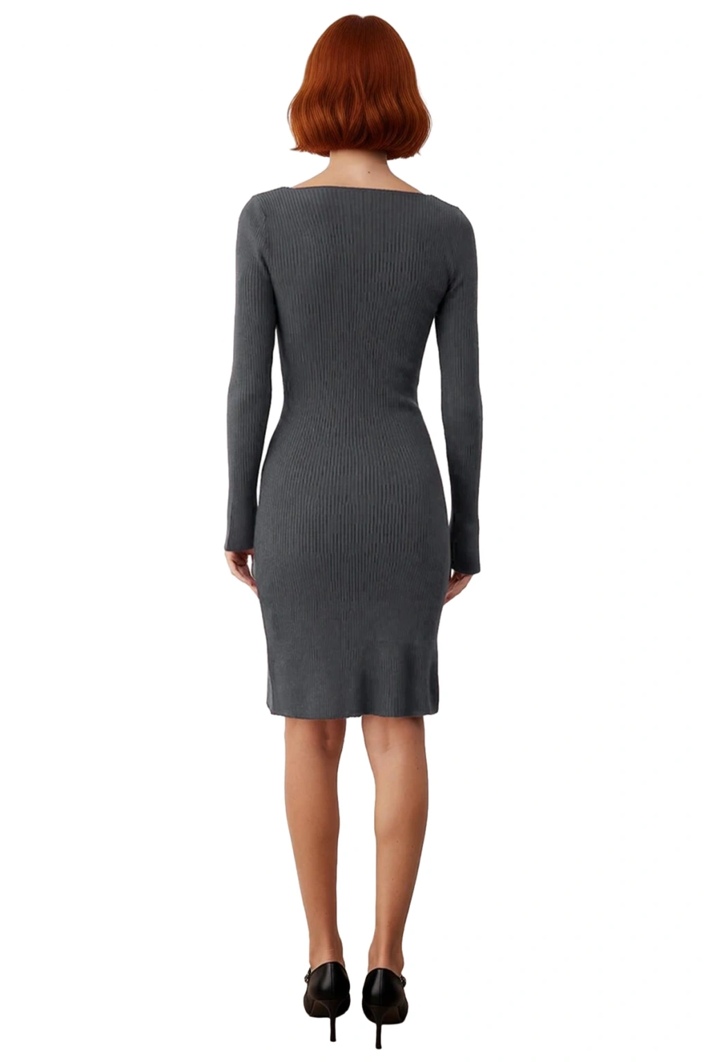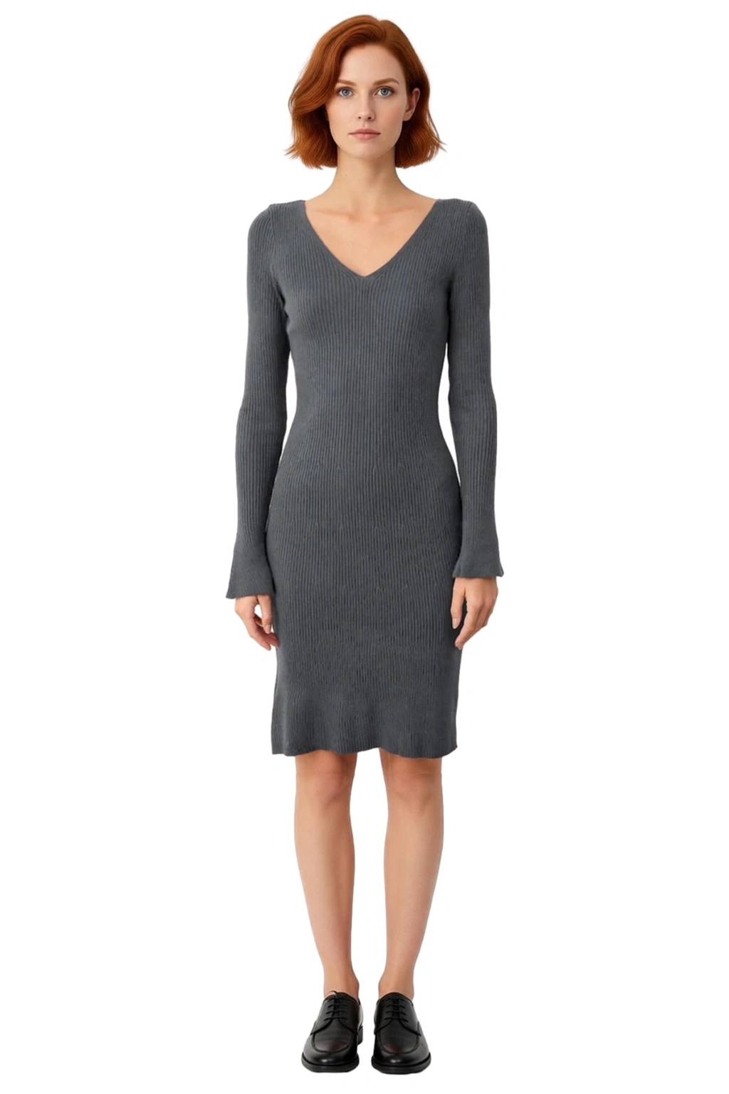 Ürün Özellikleri: Bodycon kalıp, akrilik materyal, düz desen, V yaka, standart kol, triko kumaş, gri renk.