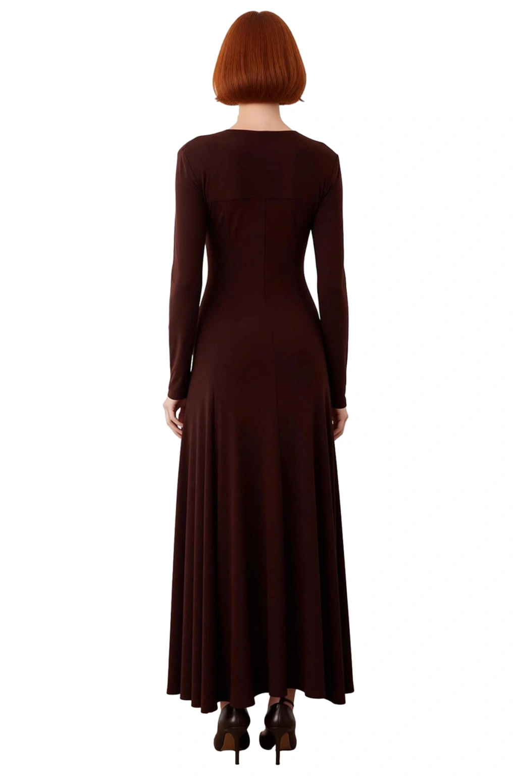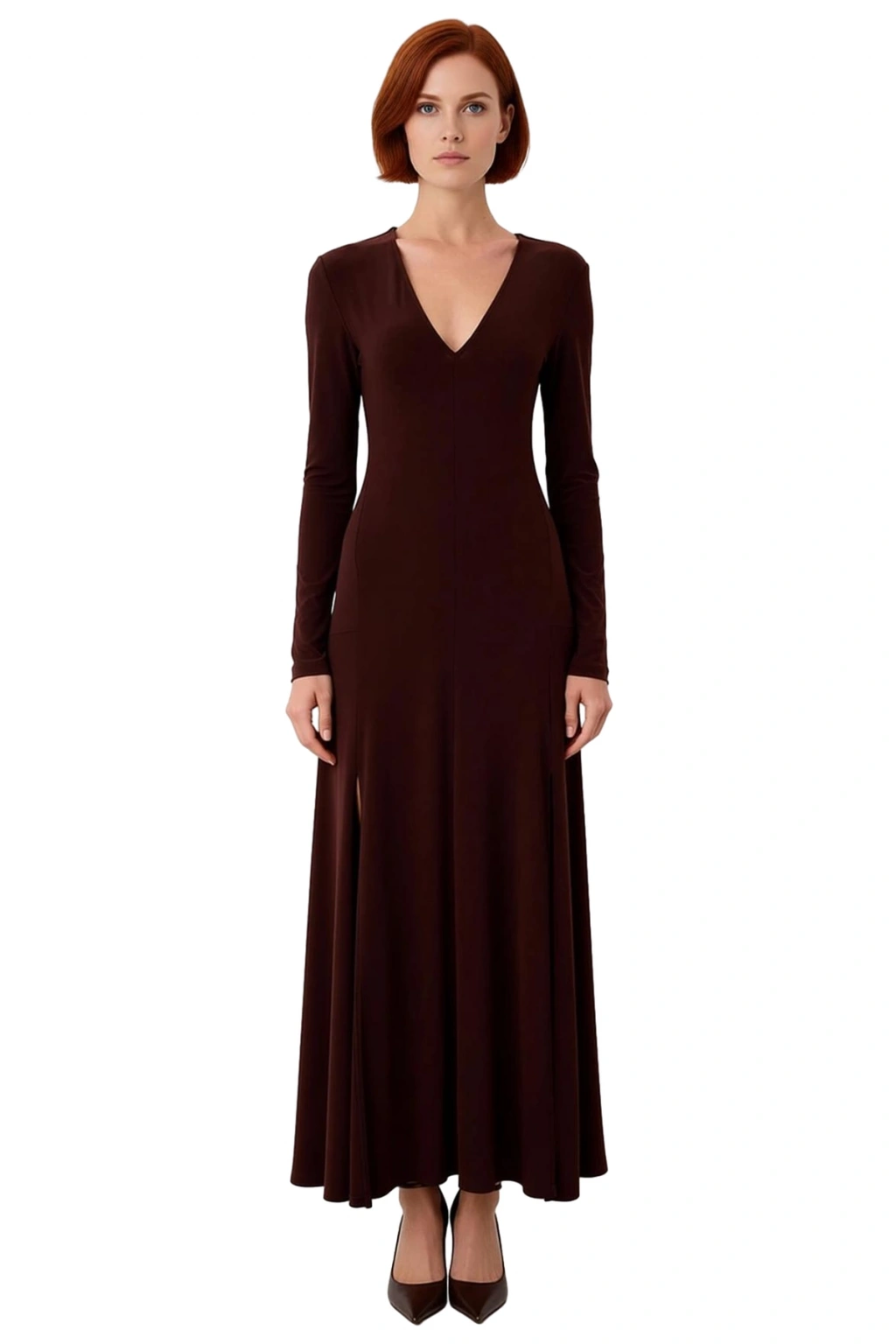 V yaka tasarımı, zarif bir dekolte sunarak boyun hattını uzun gösterir ve şık bir detay katarken, uzun standart kolları soğuk havalarda ideal koruma sağlar. Kalın sandy dokuma örme kumaşı, hem dayanıklılığı hem de yumuşak dokusuyla dikkat çeker. Yüksek yırtmaç detayı, elbiseye dinamik bir hava katarak yürüyüşünüze zarafet katar. Astarsız yapısı sayesinde hafif bir his verirken, kolay bakımı (T10 yıkama talimatı) ile pratik bir kullanım sunar.
