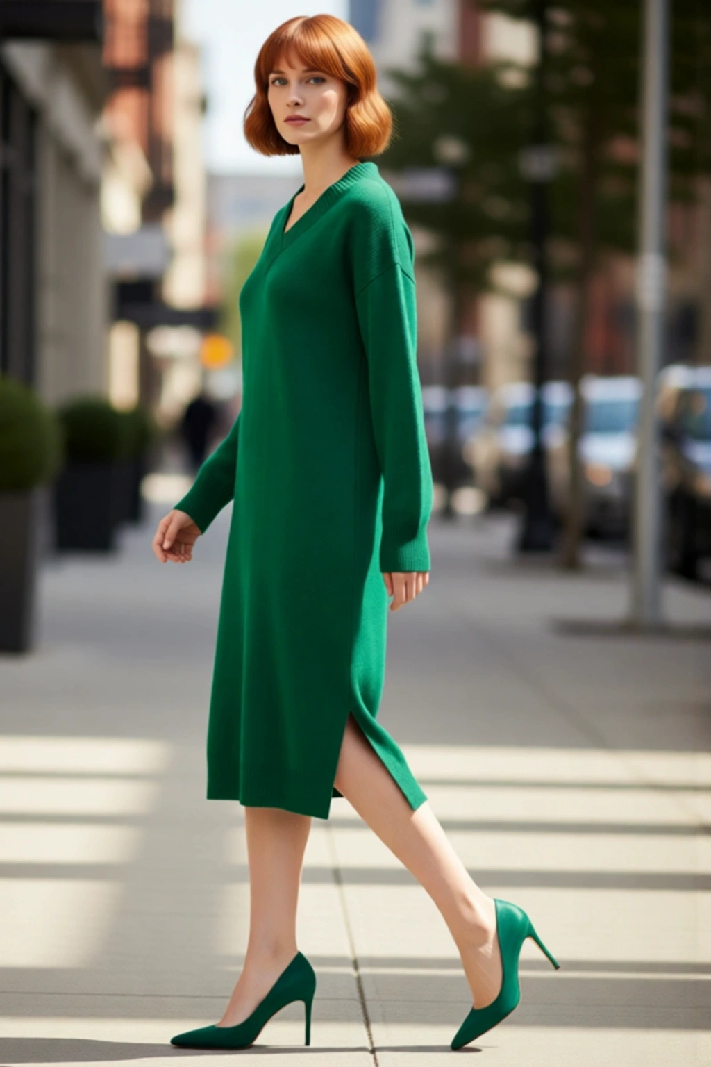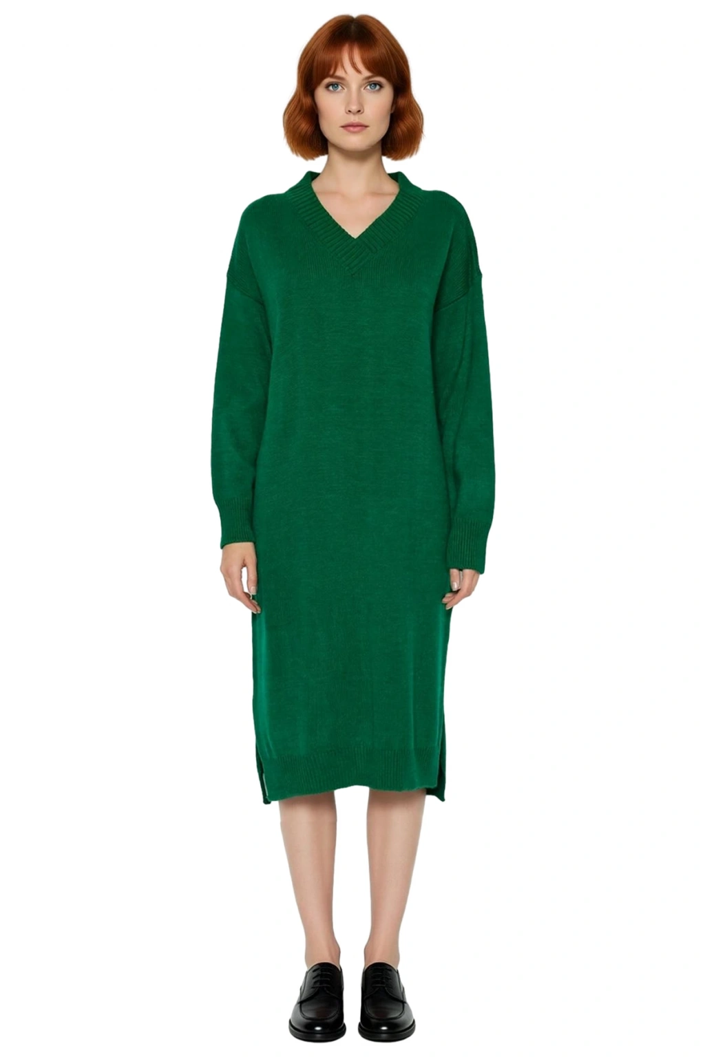 Ürün Özellikleri: Shift kalıp, akrilik materyal, düz desen, v yaka, düşük kol, triko kumaş, yeşil renk, yırtmaçlı detay.
