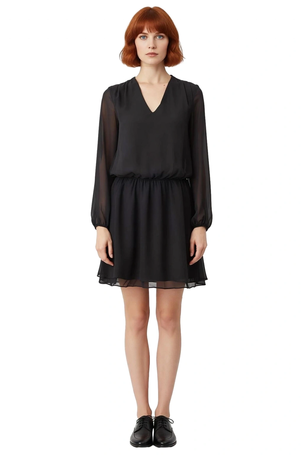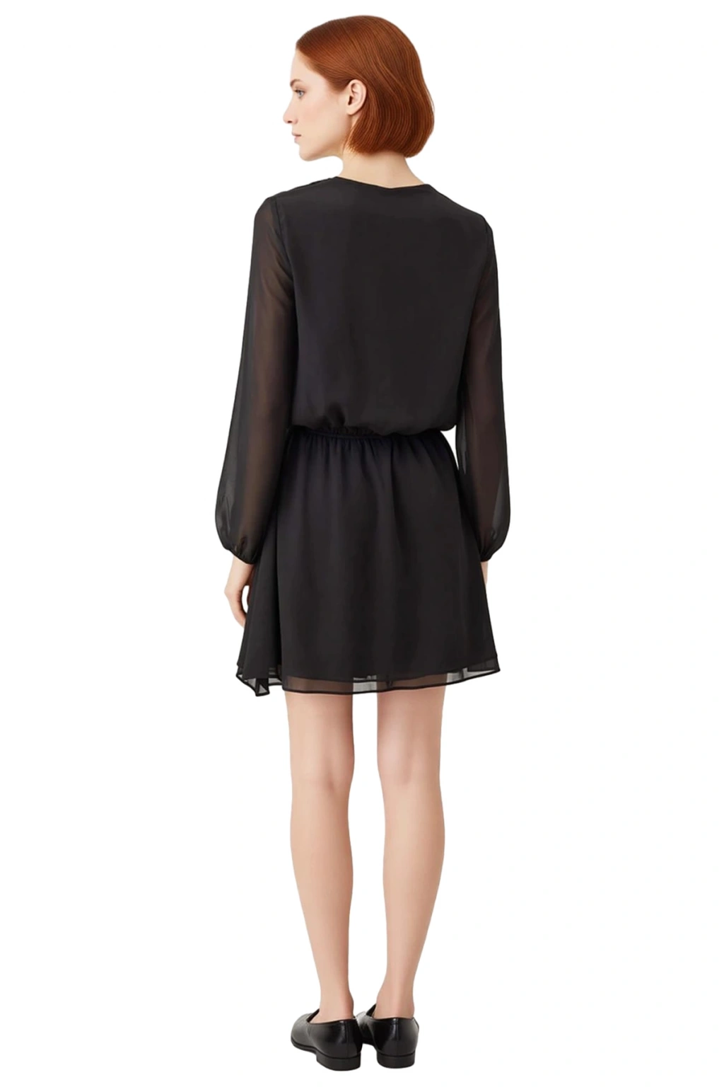 Ürün Özellikleri: Skater kalıp, %100 polyester materyal, düz desen, V yaka, balon kol, dokuma şifon kumaş, siyah renk, eteği belden açılan.