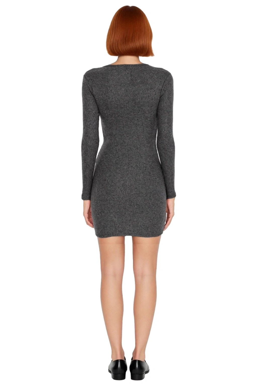 Ürün Özellikleri: Bodycon kalıp, polyester karışımlı materyal, düz desen, havuz yaka, standart kol, örme kumaş, gri renk, çıtçıt detaylı tasarım.