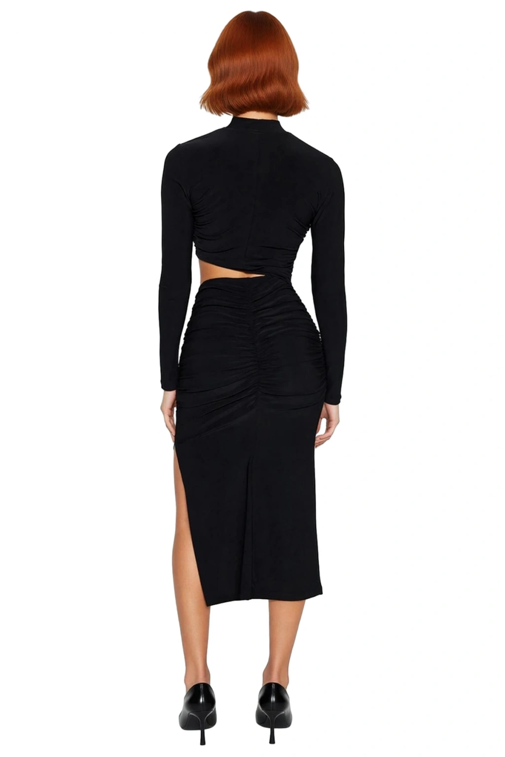 Midi boyu ve vücudu saran kesimi ile farklı vücut tiplerine uygun olan bu elbise, stiletto ve zarif takılarla tamamlanarak unutulmaz kombinler oluşturur. Şık gece, parti ve mezuniyet gibi özel ortamlarda giymek için idealdir. Kış sezonunda iç mekan etkinliklerinde rahatlıkla tercih edilebilir, dışarıda ise şık bir kaban veya palto ile kombinlenerek kullanılabilir.