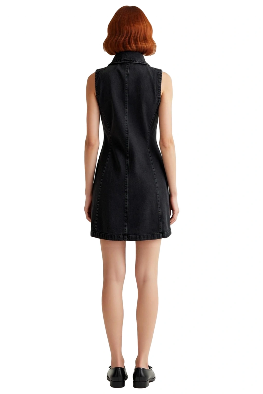 Ürün Özellikleri: A-line kalıp, %100 pamuk materyal, düz desen, dik yaka, kolsuz kol, denim kumaş, siyah renk, fermuar ve düğme detaylı, mini boy, astarsız.