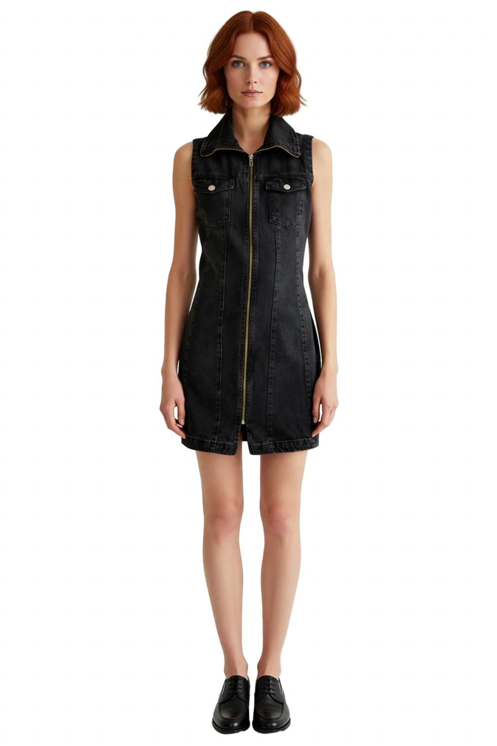 Ürün Özellikleri: A-line kalıp, %100 pamuk materyal, düz desen, dik yaka, kolsuz kol, denim kumaş, siyah renk, fermuar ve düğme detaylı, mini boy, astarsız.
