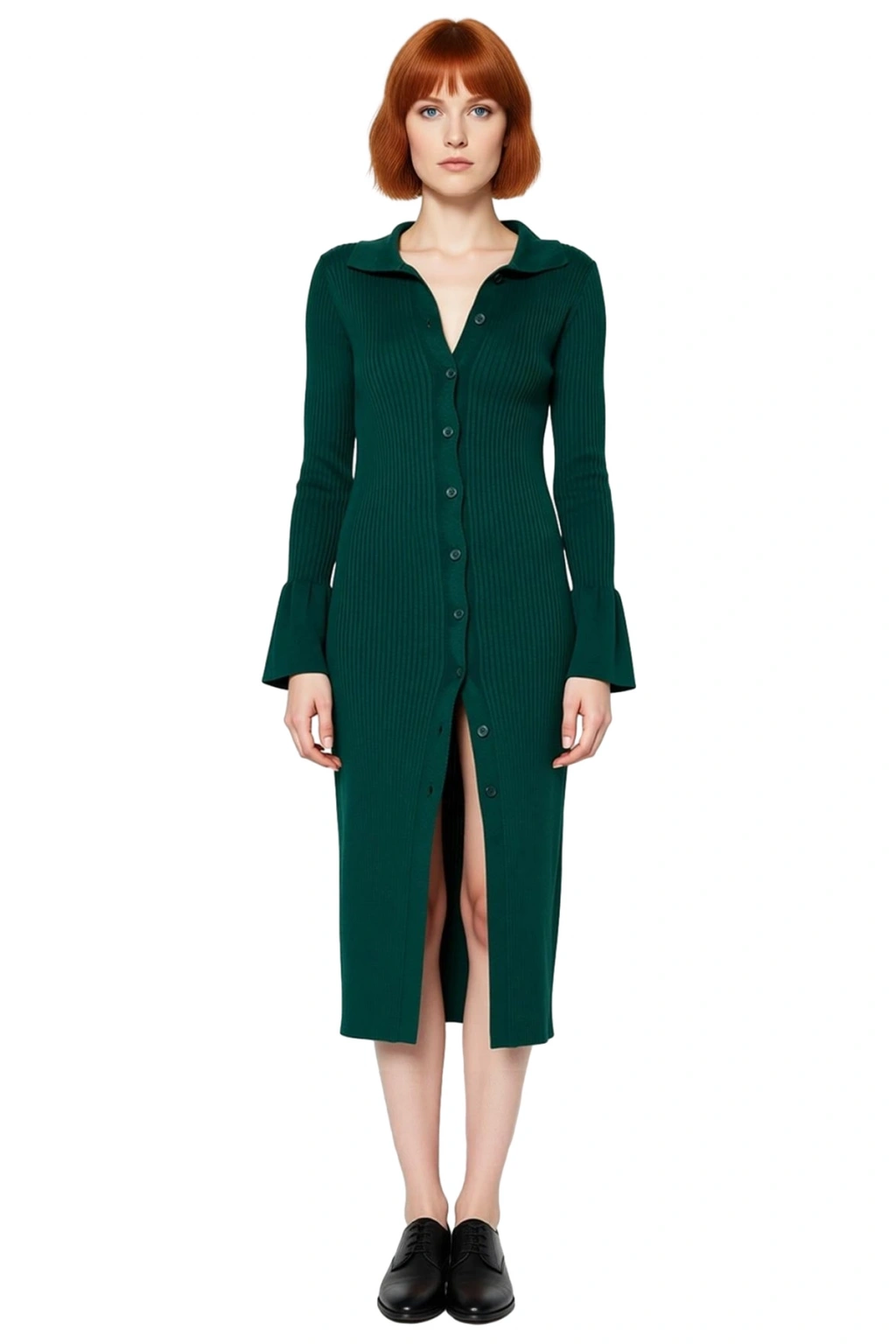 Ürün Özellikleri: Bodycon kalıp, triko materyal, düz desen, polo yaka, uzun standart kol, fitilli triko kumaş, yeşil renk.