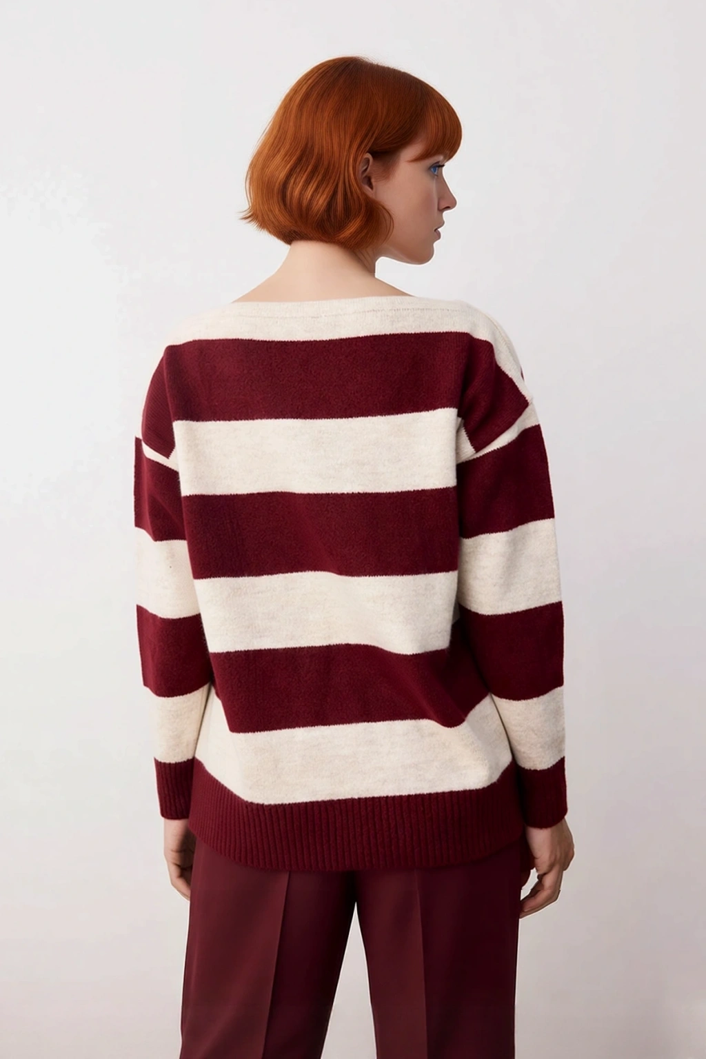 Ürün Özellikleri: Oversize kalıp, akrilik polyester karışım materyal, renk bloklu çizgili desen, kayık yaka, standart kol, triko kumaş, ekru bordo renk.