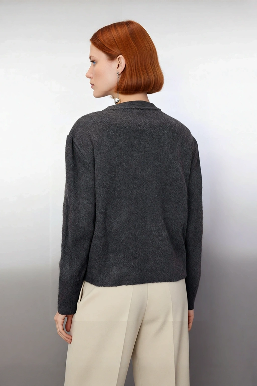 Ürün Özellikleri: Regular kalıp, %100 akrilik materyal, düz desen, bisiklet yaka, standart kol, triko kumaş, gri renk.
