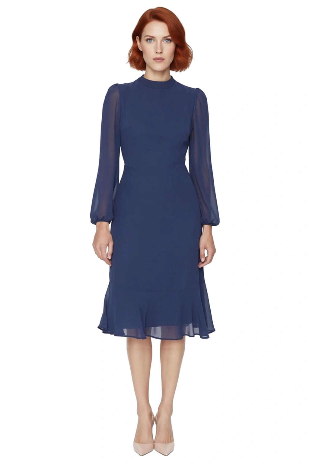 Ürün Özellikleri: A kesim kalıp, %100 polyester materyal, düz desen, dik yaka, uzun balon kol, şifon dokuma kumaş, lacivert renk, astarlı tasarım.