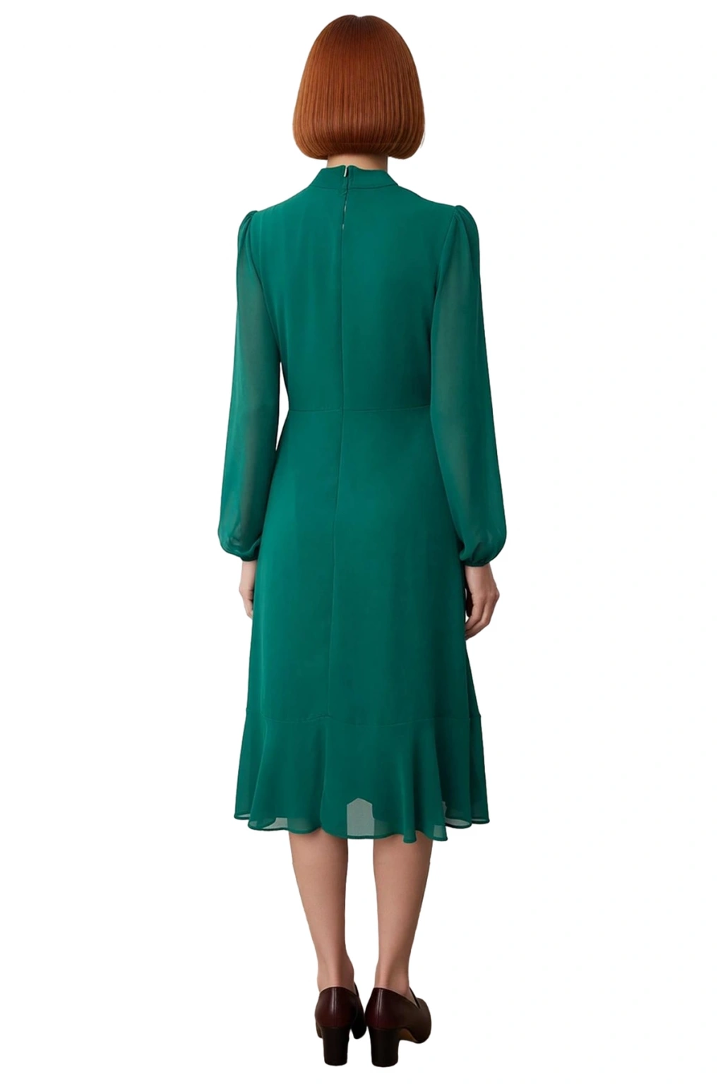Elbisenin dik yaka tasarımı, boynu nazikçe sararak sofistike bir hava katarken, uzun kol yapısı mevsim geçişlerinde ideal bir kullanım sunar. Kolların balon kesimi, modern bir dokunuşla feminen bir detay ekler. Tamamen astarlı yapısı sayesinde iç göstermeyen bu elbise, gün boyu konforlu ve güvenli bir kullanım sağlar. Etek ucundaki fırfırlı bitiş, elbiseye dinamik bir hareketlilik ve romantik bir hava katar. Cepsiz tasarımı, elbisenin akıcı ve sade çizgisini korurken, genel estetiği tamamlar. Bakım kolaylığı sunan yapısıyla pratik bir kullanım vadeder.