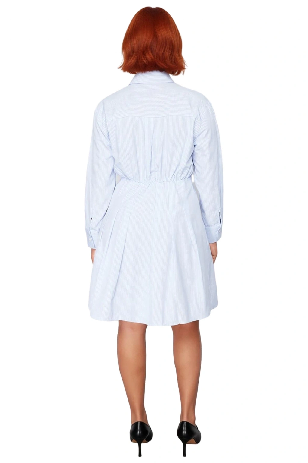 Ürün Özellikleri: A-line kalıp, pamuk polyester karışımı materyal, çizgili desen, gömlek yaka, uzun kol, dokuma kumaş, mavi renk.