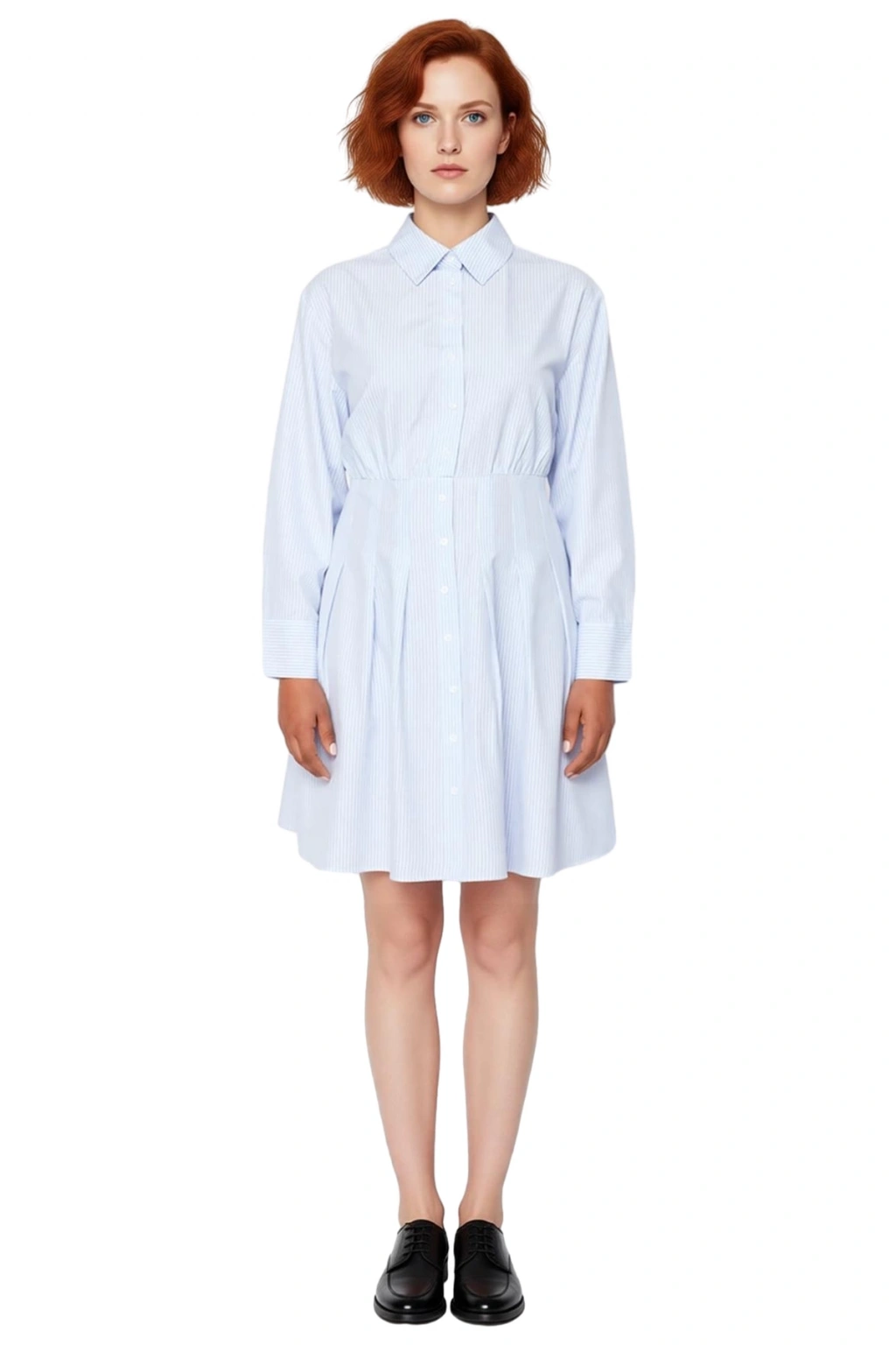 Ürün Özellikleri: A-line kalıp, pamuk polyester karışımı materyal, çizgili desen, gömlek yaka, uzun kol, dokuma kumaş, mavi renk.