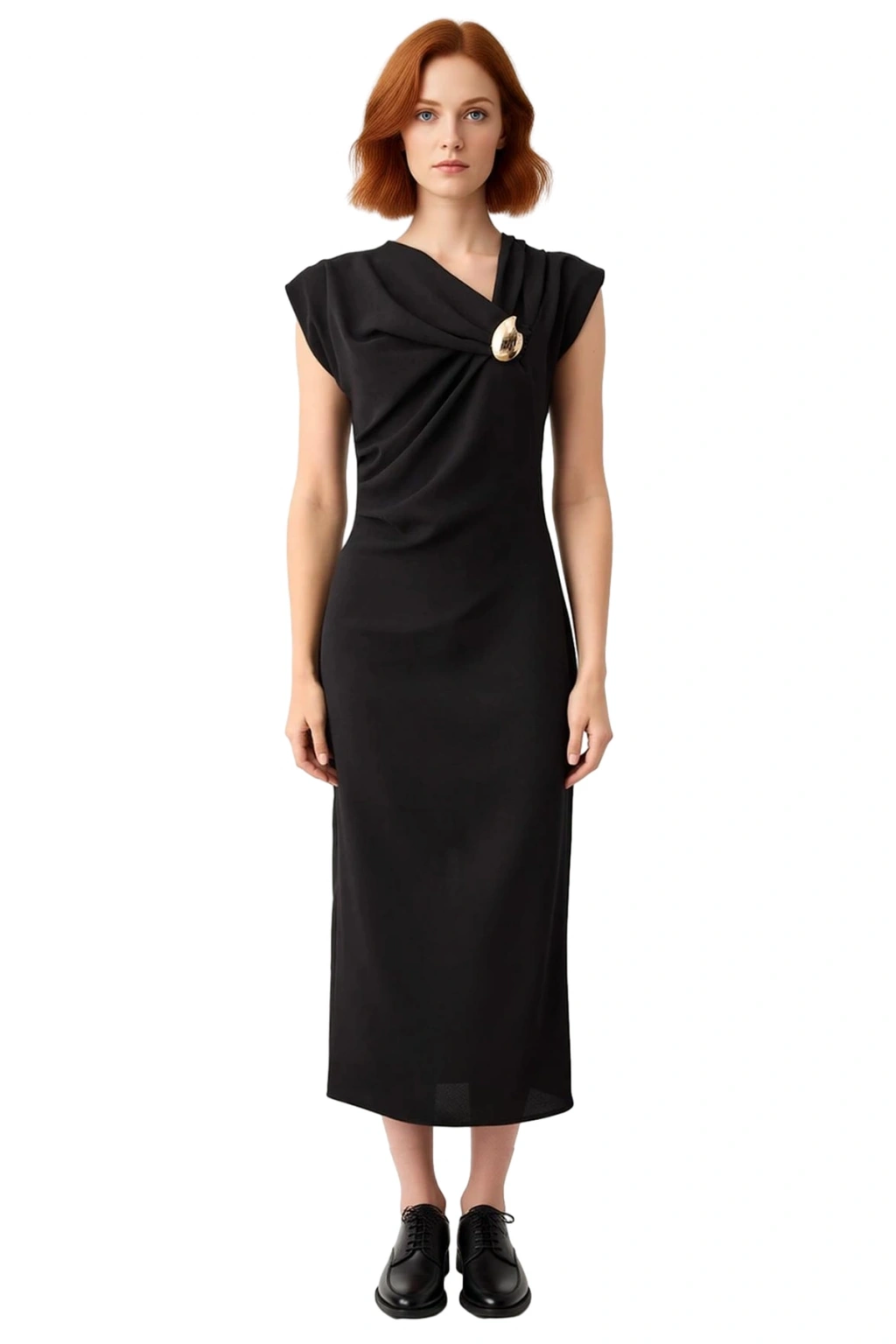 Degaje yaka tipi, zarif bir boyun dekoltesi oluştururken, düşük kısa kol yapısı modern ve kullanışlı bir tasarım sunar. Dokuma krep kumaş tipi, elbiseye akışkan ve dökümlü bir yapı kazandırır, bu da her hareketinizde zarafeti ön plana çıkarır. Astarsız oluşu hafiflik sağlarken, kaliteli polyester materyali sayesinde dayanıklıdır ve uzun süreli kullanım imkanı sunar. Bakım kolaylığıyla da dikkat çeken bu elbise, yoğun tempolu günlerinizde bile şıklığınızdan ödün vermemenizi sağlar.