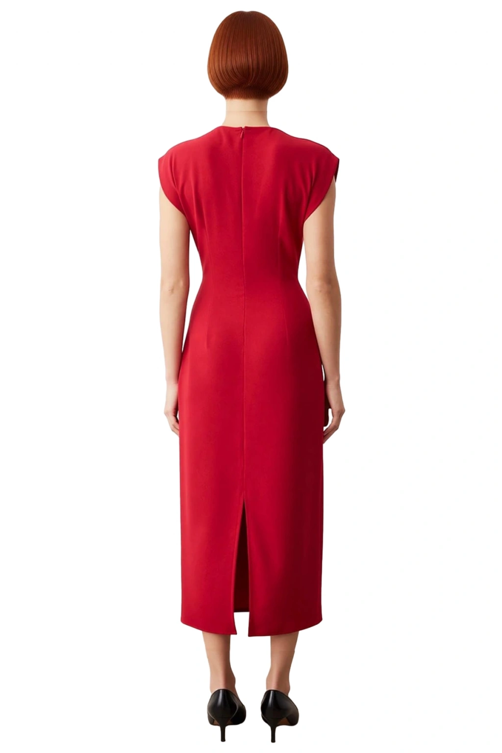 Ürün Özellikleri: Shift kalıp, 100% Polyester materyal, düz desen, degaje yaka, düşük kısa kol, dokuma krep kumaş, kırmızı renk, aksesuar detaylı, midi boy.