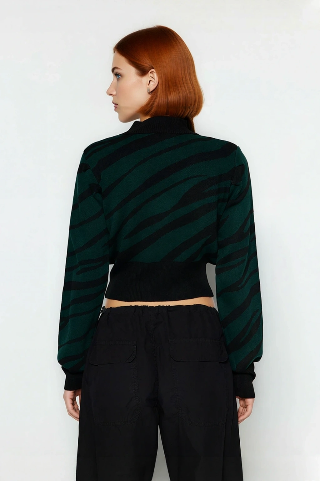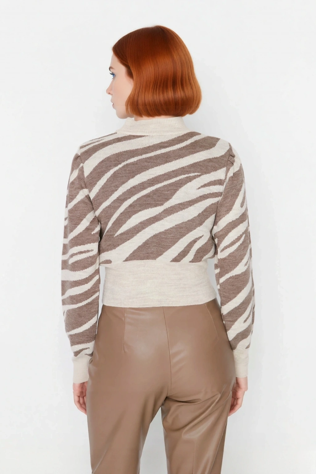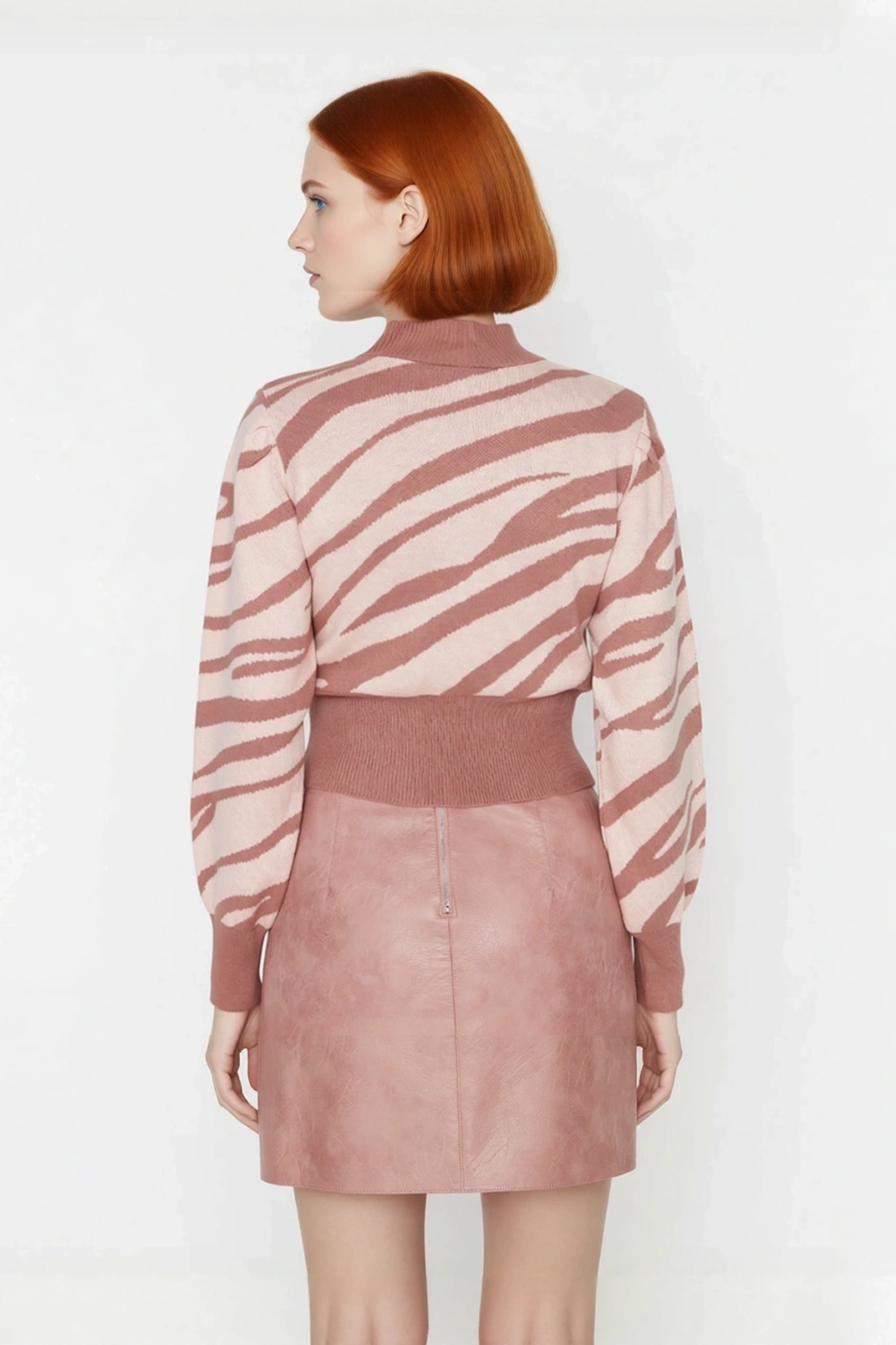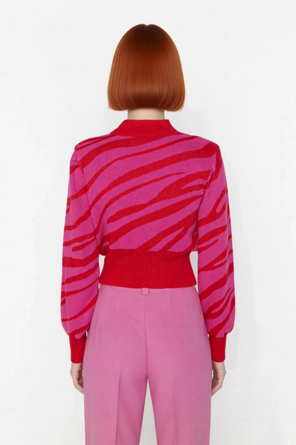 Ürün Özellikleri: Regular kalıp, akrilik materyal, zebra desen, dik yaka, standart kol, triko kumaş, pembe renk.