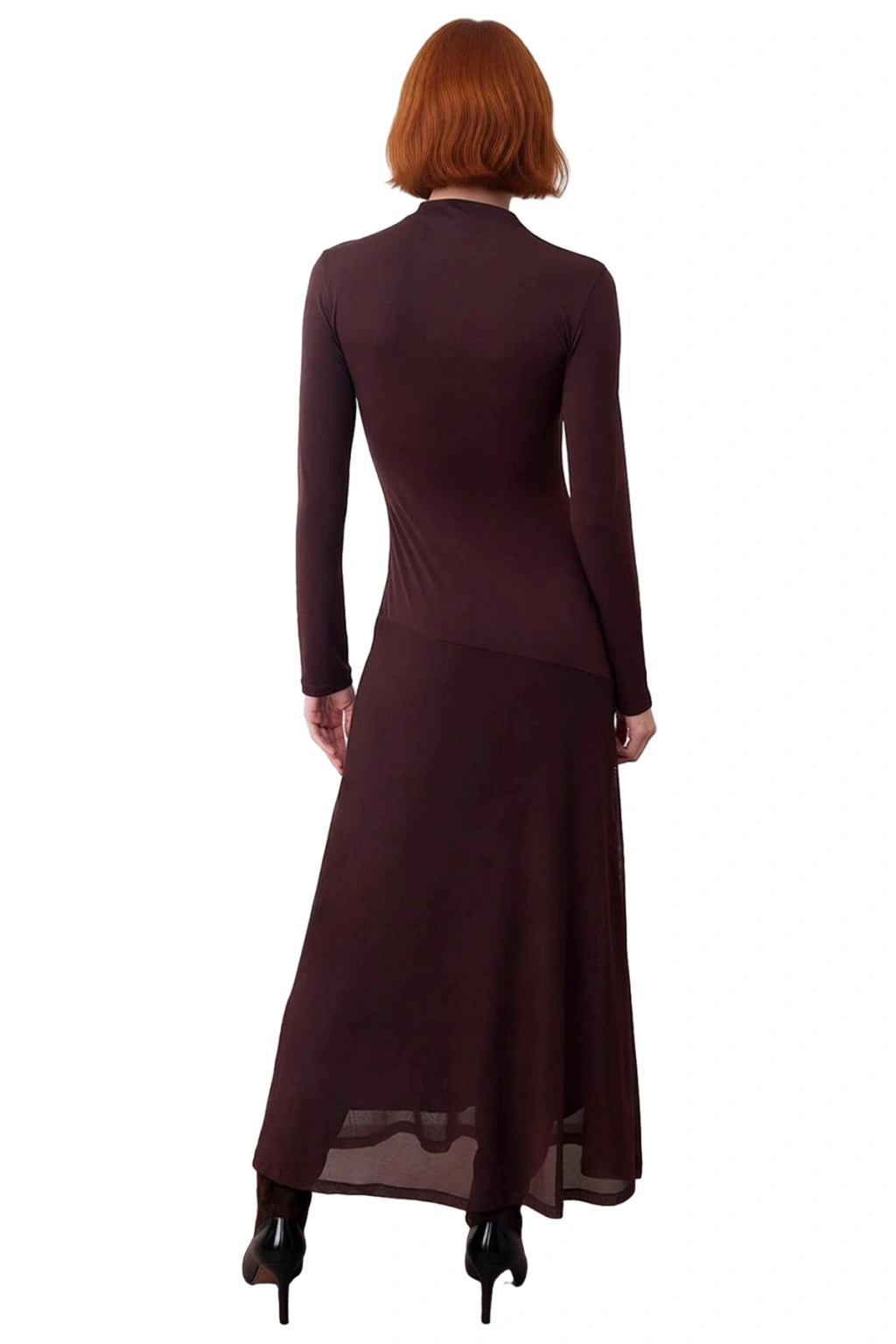 Ürün Özellikleri: A-line kalıp, %96 polyester %4 elastan materyal, düz desen, dik yaka, standart kol, örme kumaş, kahverengi renk, tül garni detaylı, astarlı tasarım.