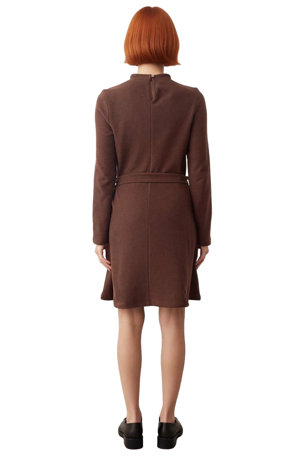 Ürün Özellikleri: A-line kalıp, örme materyal, düz desen, dik yaka, standart uzun kol, selanik dokuma, kahverengi renk, kemerli detay, astarsız.