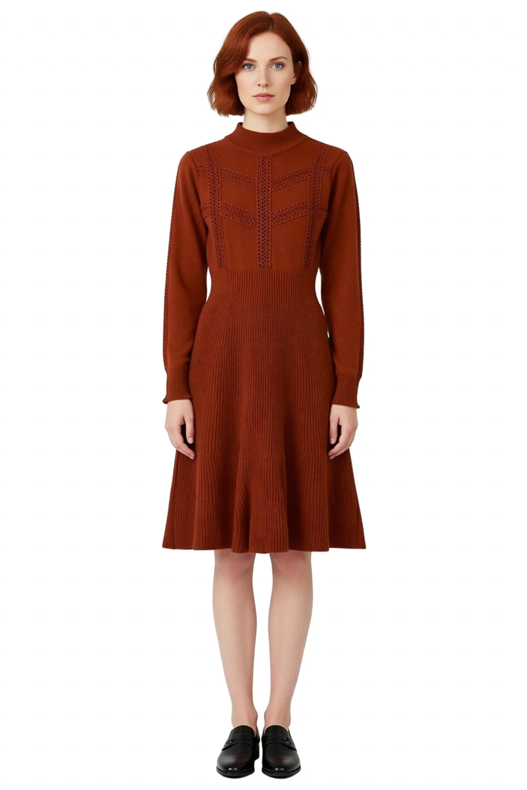 Bu şık kadın triko elbise, zarafeti ve konforu bir araya getiren A-line kalıbı ile dikkat çekici bir siluet oluşturur. Yüksek kaliteli %100 akrilik materyali sayesinde kış aylarının soğuk günlerinde sizi sıcacık tutarken, tenle dost yumuşak dokusu gün boyu rahatlık sunar. Bej rengi, her gardıroba kolayca uyum sağlayarak zamansız bir şıklık katarken, dik yaka tasarımı boynunuzu nazikçe sararak ekstra sıcaklık ve sofistike bir görünüm sağlar. Elbisenin genel düz deseni, triko dokusunun doğal zenginliği ve zarif örgü detayları ile modern bir hava kazanır. Feminine duruşuyla stilinizi tamamlar.