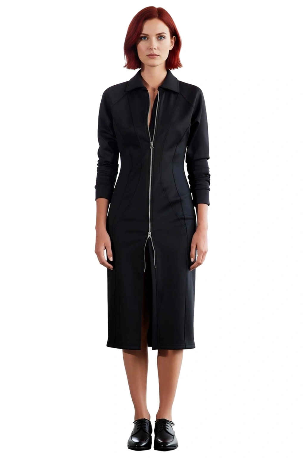Elbisenin polo yaka detayı, hem şık hem de spor bir hava katarken, tam boy fermuar kapama özelliği ise hem pratiklik hem de stil sahibi bir detay sunar. Fermuarı dilediğiniz kadar açarak farklı görünümler yaratabilir, etek kısmında modern bir yırtmaç etkisi oluşturabilirsiniz. Uzun ve düşük kollu tasarımı, sofistike bir duruş sergilerken, 2 iplik penye kumaş tipi dayanıklılığı ve yumuşak dokuyu bir araya getirir. Cepsiz, astarsız ve kemersiz yapısı sayesinde sade ve zarif bir bütünlük oluşturur. Baskısız tasarımıyla minimalizmi vurgularken, kolay bakımıyla da öne çıkar.
