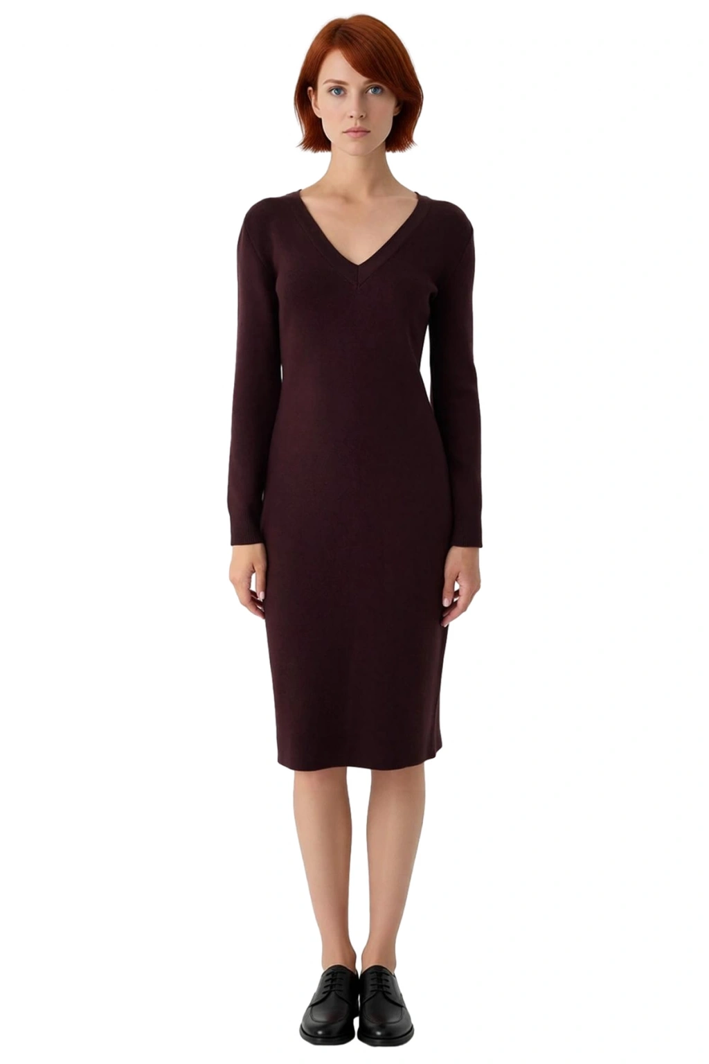 Ürün Özellikleri: Bodycon kalıp, viskoz polyester poliamid materyal, düz desen, V yaka, standart kol, triko kumaş, kahverengi renk.