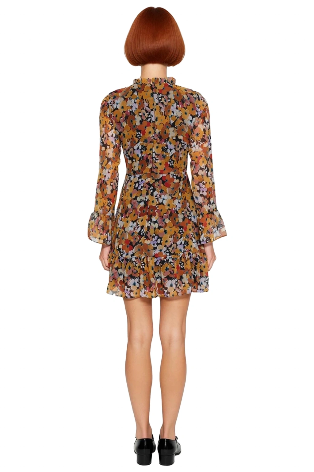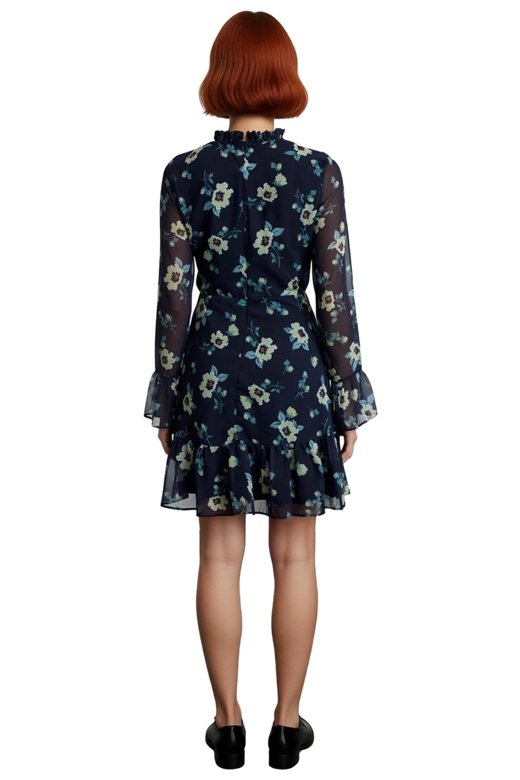 Ürün Özellikleri: A-line kalıp, dokuma şifon materyal, çiçekli desen, dik yaka, ispanyol kol, şifon kumaş, çok renkli, astarlı tasarım.
