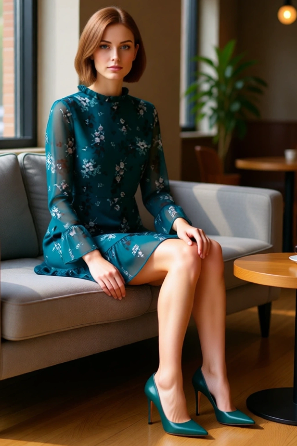 Elbisenin fırfır detaylarıyla bezeli dik yaka tasarımı, boyun bölgesine narin ve çekici bir görünüm kazandırır, klasik çizgilerle modern dokunuşları birleştirir. Uzun ispanyol kol tipi, uç kısmındaki fırfırlı detaylarla hareketli bir hava katarken, zarif ve akıcı bir siluet yaratır. İnce ve hafif şifon kumaş dokusu, özellikle sıcak havalarda nefes alabilirlik sağlayarak ferah bir kullanım sunar. Cepsiz ve kemersiz tasarımı, elbisenin genel akışkanlığını ve minimalist şıklığını korurken, kolay ütülenebilir ve makinede yıkanabilir özelliğiyle pratik bir kullanım sunar.