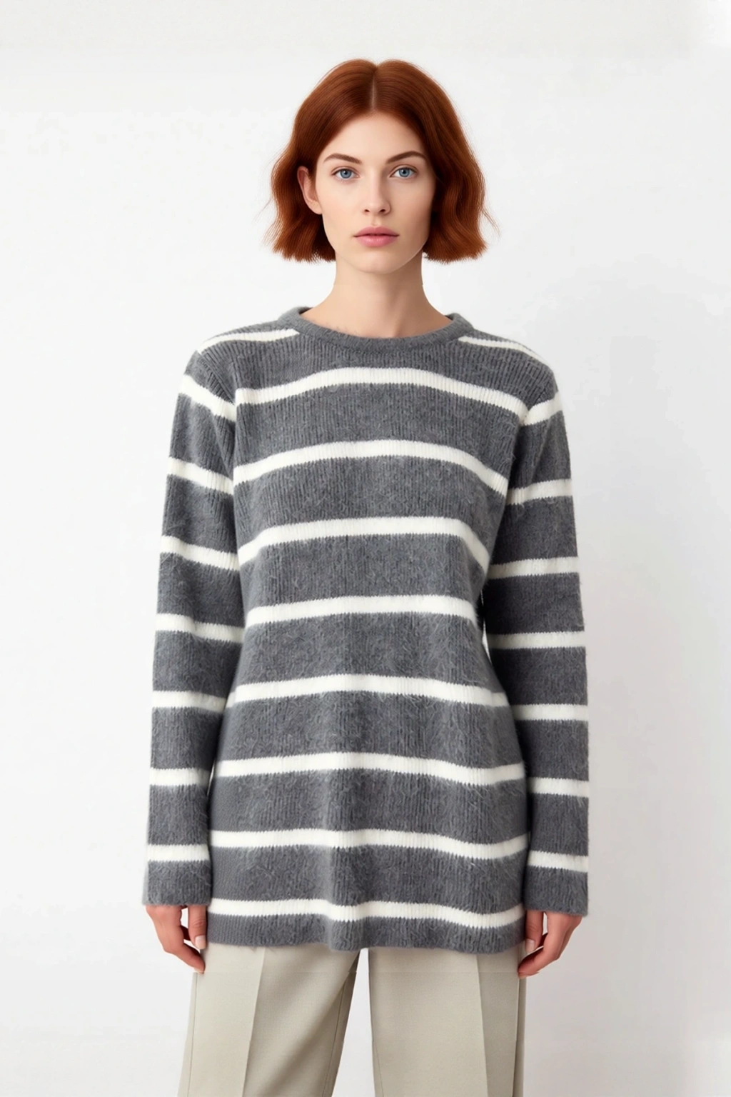 Ürün Özellikleri: Regular kalıp, %100 akrilik materyal, çizgili desen, bisiklet yaka, düşük kol, triko kumaş, gri renk, tesettür giyim, tek plaka dokuma, cool & comfort persona.